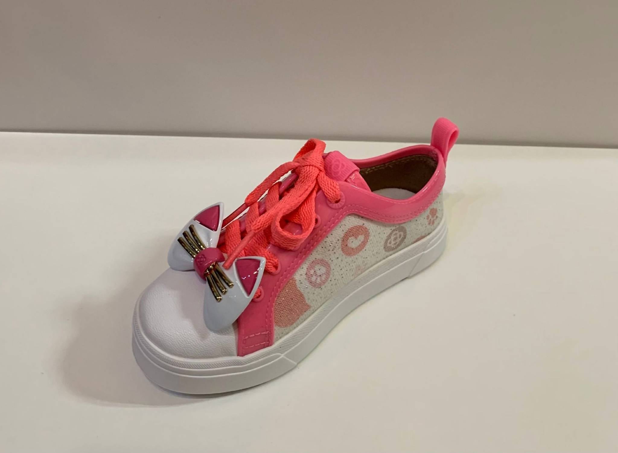 Let your little one step out in style. Streetwear-inspired sneakers in a whimsical pink color feature a round toe and a low platform heel, perfect for spring adventures. Designed with playful elements. Ideal for travel and add a fun feline flair to any outfit. Perfect for little girls who love to showcase their unique style.