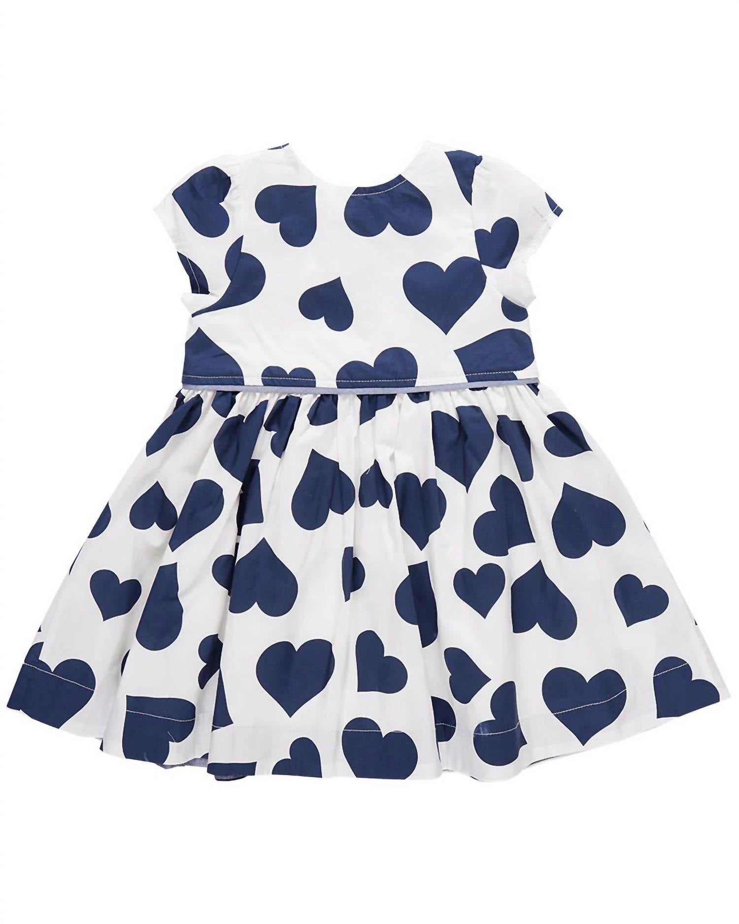 The Girls Fatima Dress by Pink Chicken is the perfect summer piece for your little fashionista. Designed from 100% cotton, it features a charming navy and white tossed heart pattern with a practical button front. This casual dress showcases a minimalist graphic style, perfect for a vacation wardrobe. Care instructions recommend hand washing to maintain its quality.