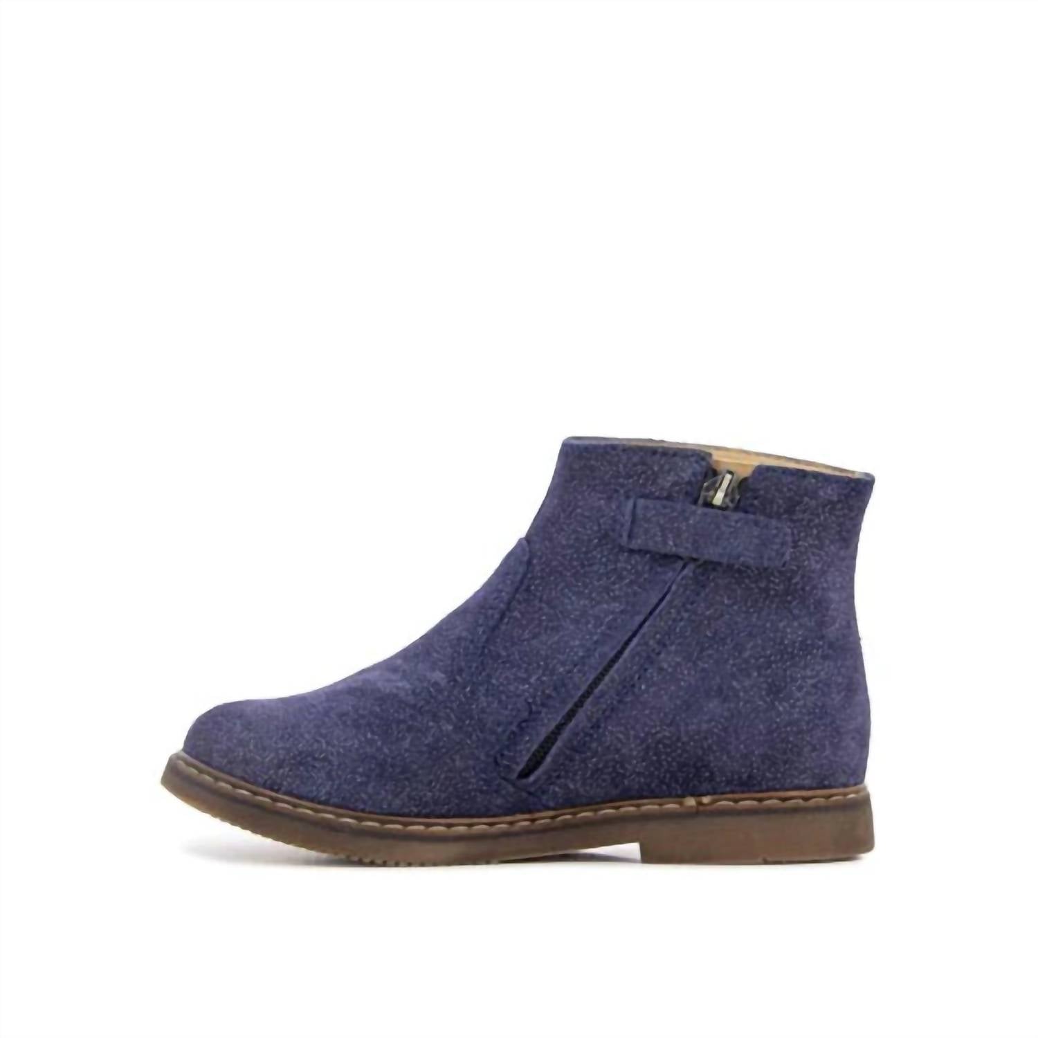 Introduce your little one to stylish practicality with the Girl's City Colibri Suaflex Bootie by Pom d'Api. These high-top ankle boots in marine navy leather feature a shimmery suede finish adorned with a charming embroidered Colibri applique, adding a splash of color with greens, purples, pinks, and golds. Crafted in Tunisia, they boast a comfortable, soft leather lining and a non-slip brown rubber sole for sturdy steps. A convenient zip closure with a small Velcro tab ensures easy wear for busy little feet.