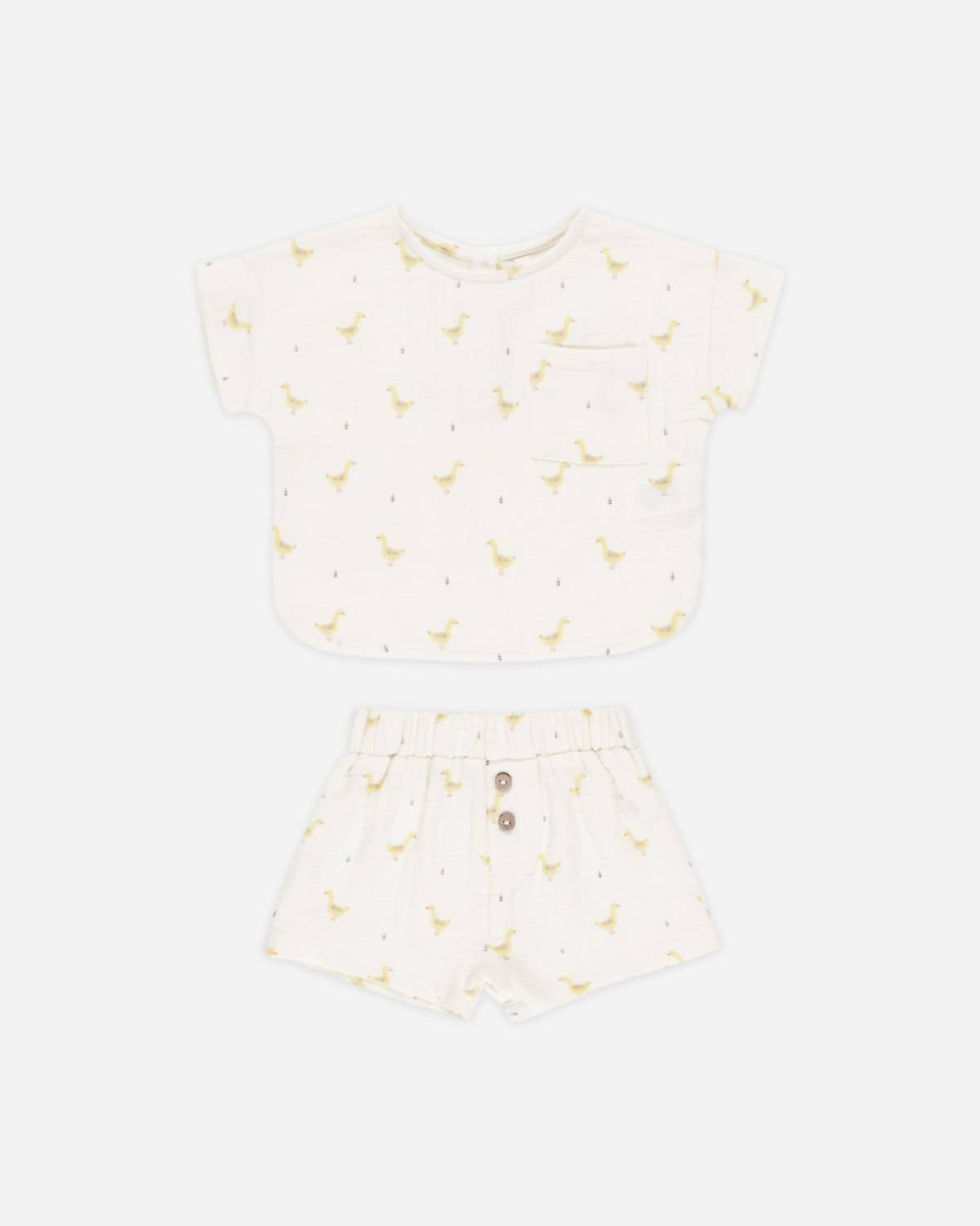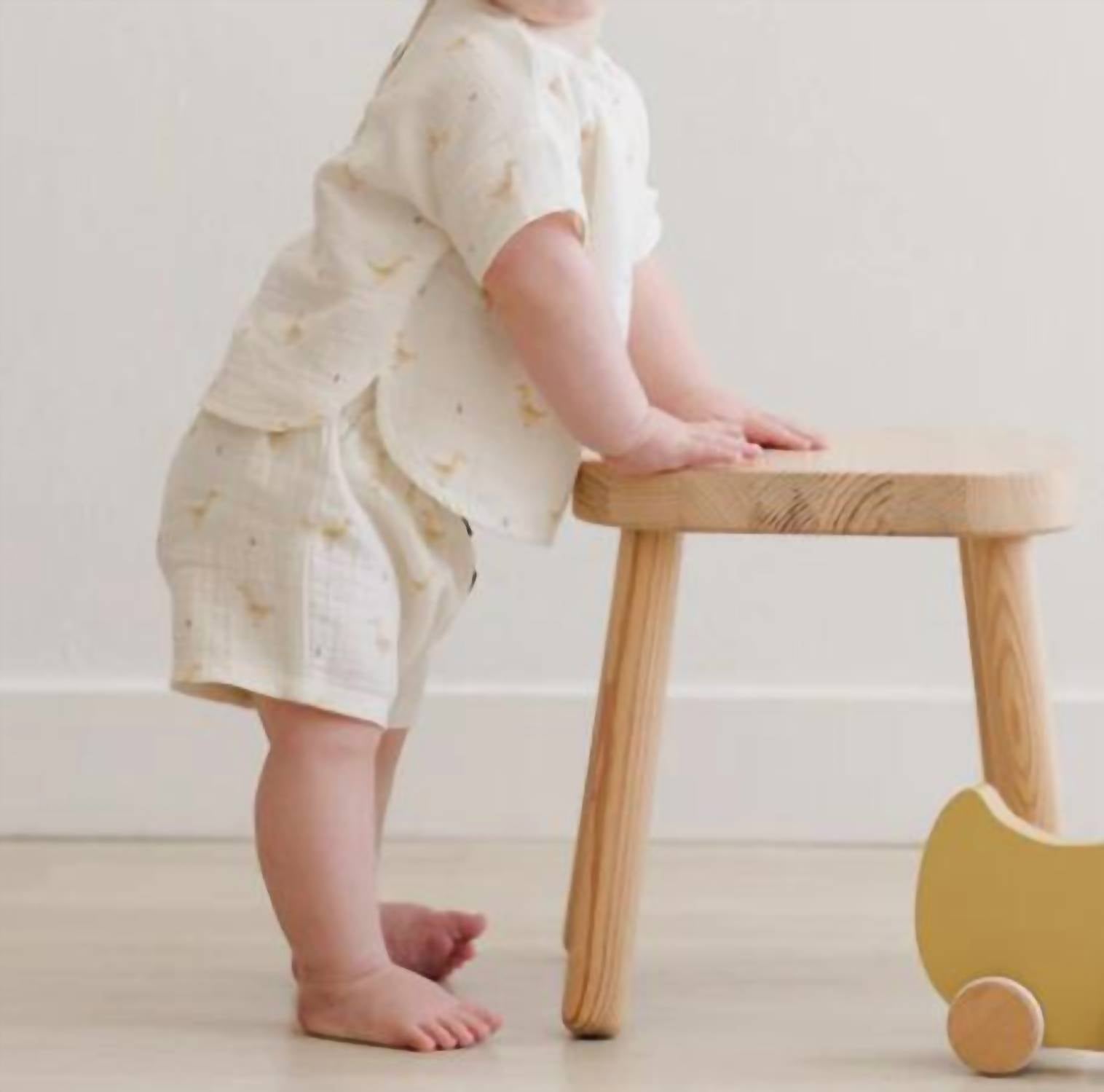 This woven set includes a boxy tee and matching shorts, creating an easy, comfortable outfit for the season. Thoughtful details like coconut buttons at the back neckline and front of the shorts add a charming touch. Featuring a playful all-over print, it’s perfect for little explorers. Made from 100% organic cotton and easy to care for—just machine wash and hang to dry.