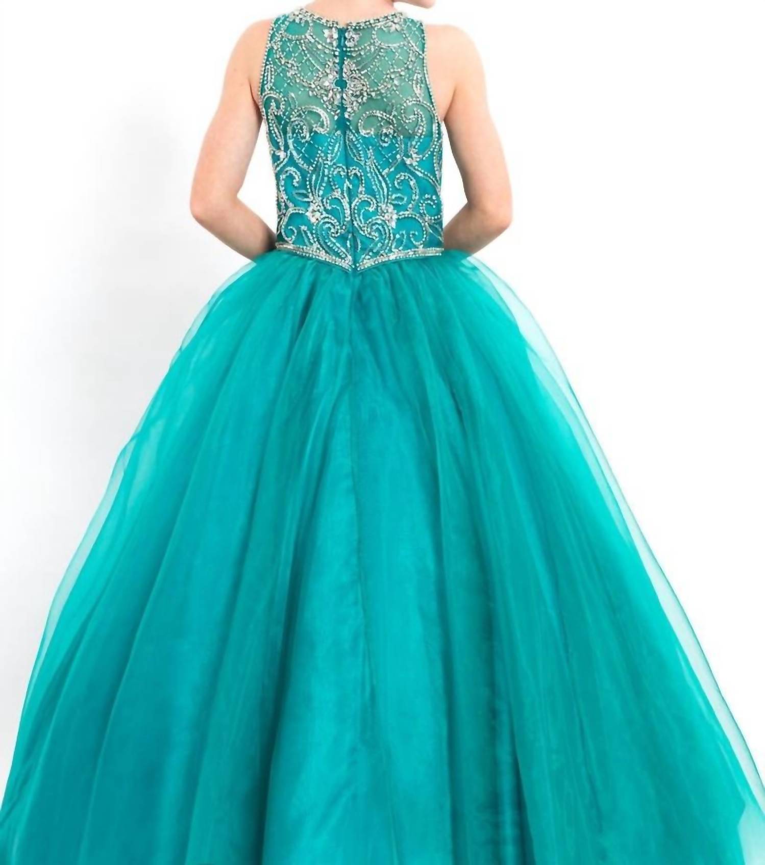 Presenting the Halter Beaded Organza Pageant Ball Gown by RACHEL ALLAN, a stunning choice for evening events. This elegant gown features an intricate beaded bodice and is crafted from organza, perfect for a sophisticated look. The halter neckline complements the regal ball gown silhouette, closing securely with a back zip. Available in a striking jade color, this gown is ideal for girls aiming to make a memorable impression.