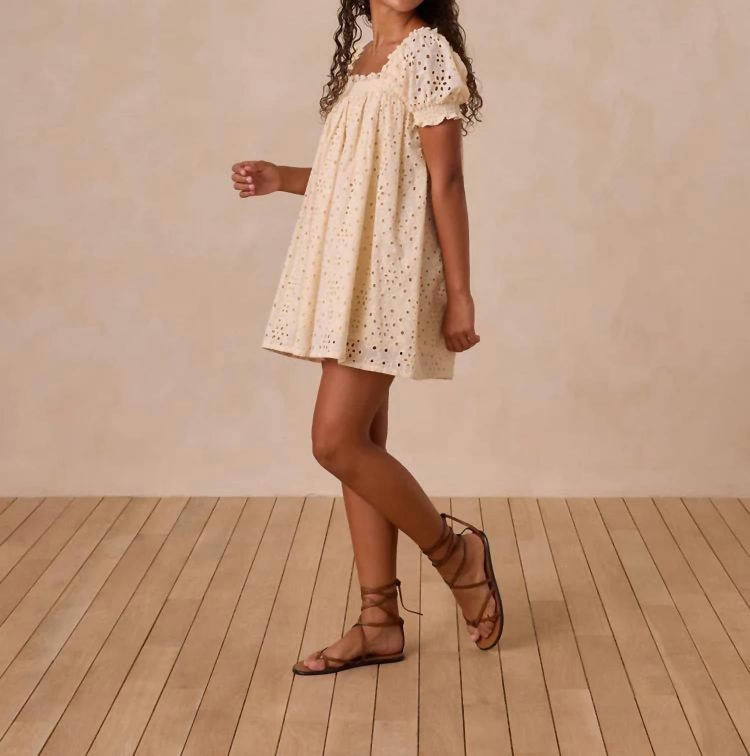 Introducing the Rylee + Cru Milan Dress, a stunning eyelet dress perfect for any occasion. This dress features delicate puff sleeves and smocked details at the neck and sleeves, adding a touch of elegance to your child's wardrobe. Crafted from 100% Cotton in a charming natural hue, this dress promises comfort and style. Care is easy with machine wash cold instructions—simply hang dry afterward.