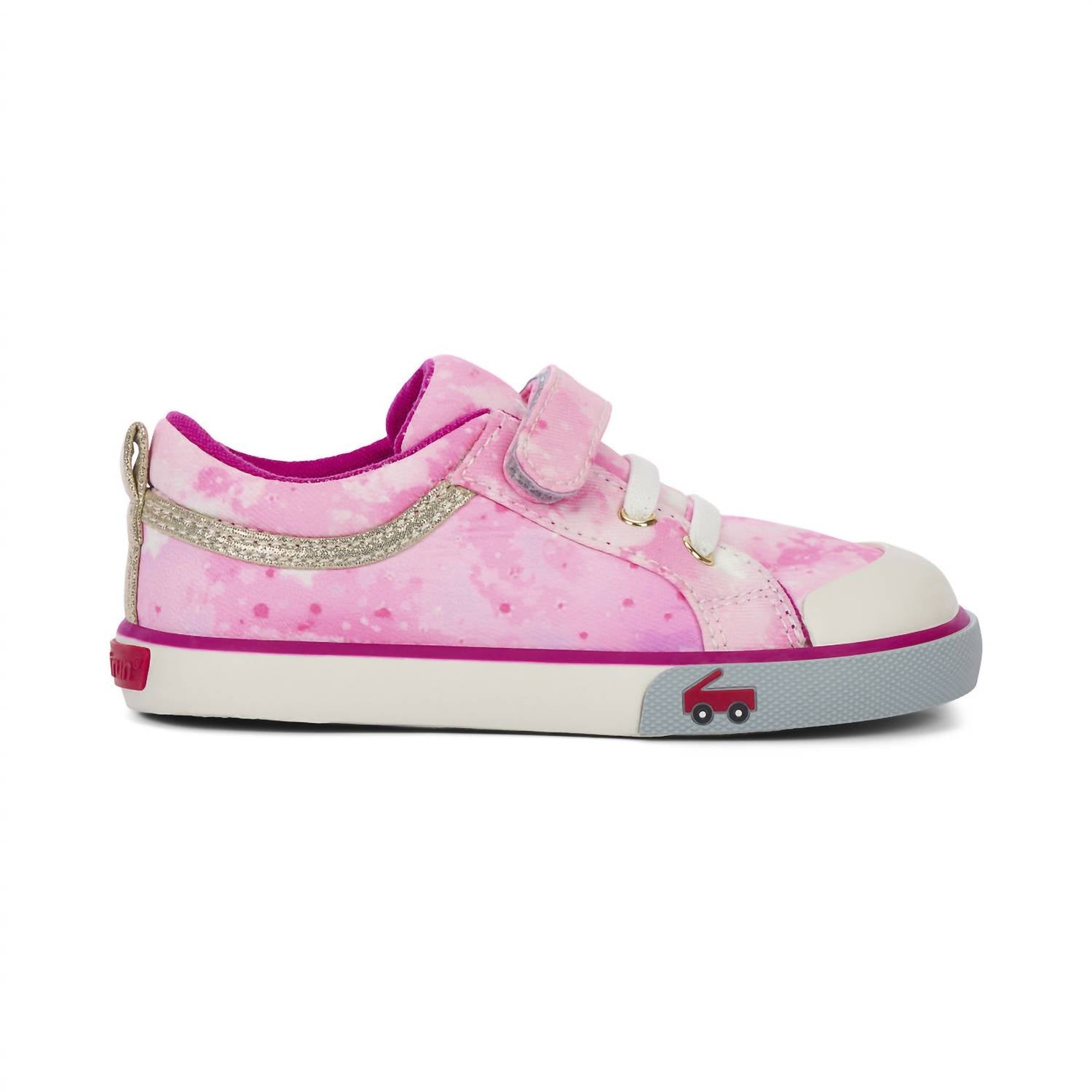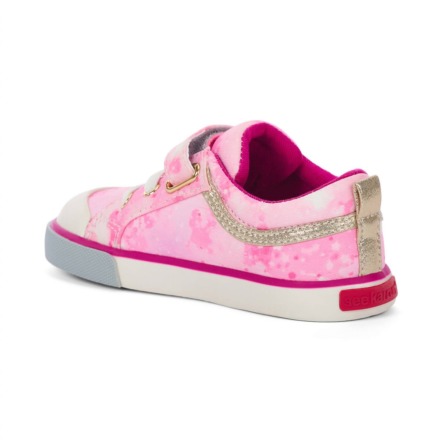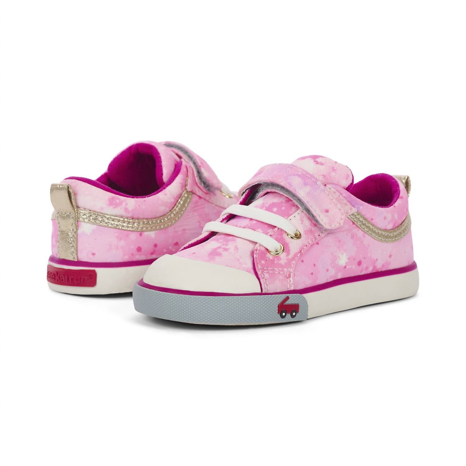 Introducing the Girl's Kristin Kids Sneaker by See Kai Run, a fun-filled choice for active little ones. Designed with a soft pink star textile upper and rubber toe cap, these sneakers ensure protection during play. The shoe features a breathable cotton canvas lining with a removable, leather-lined footbed for all-day comfort, and a natural rubber outsole with a herringbone pattern for superior traction. Closure: Hook-and-loop strap with faux elastic laces for a secure, adjustable fit. Ideal for birthdays and summer streetwear occasions, this sneaker supports foot health, having earned the Seal of Acceptance from the American Podiatric Medical Association.