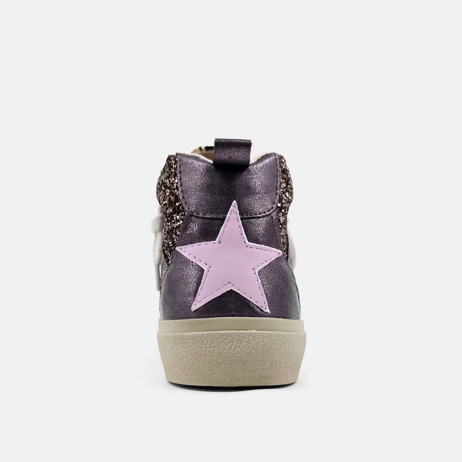 Discover the Girl's Riley Mid-rise Sneaker by SHU SHOP, a stylish footwear choice for little trendsetters. Crafted from durable rubber, these sneakers boast a striking pewter glitter finish with a whimsical lilac star accent and a charming wing tip suede design on the toe. Perfect for the summer season and Easter celebrations, these slip-on sneakers offer both comfort and flair for your little one's strides. Ideal for streetwear and special occasions like anniversaries, they're the coolest addition to any toddler's wardrobe.