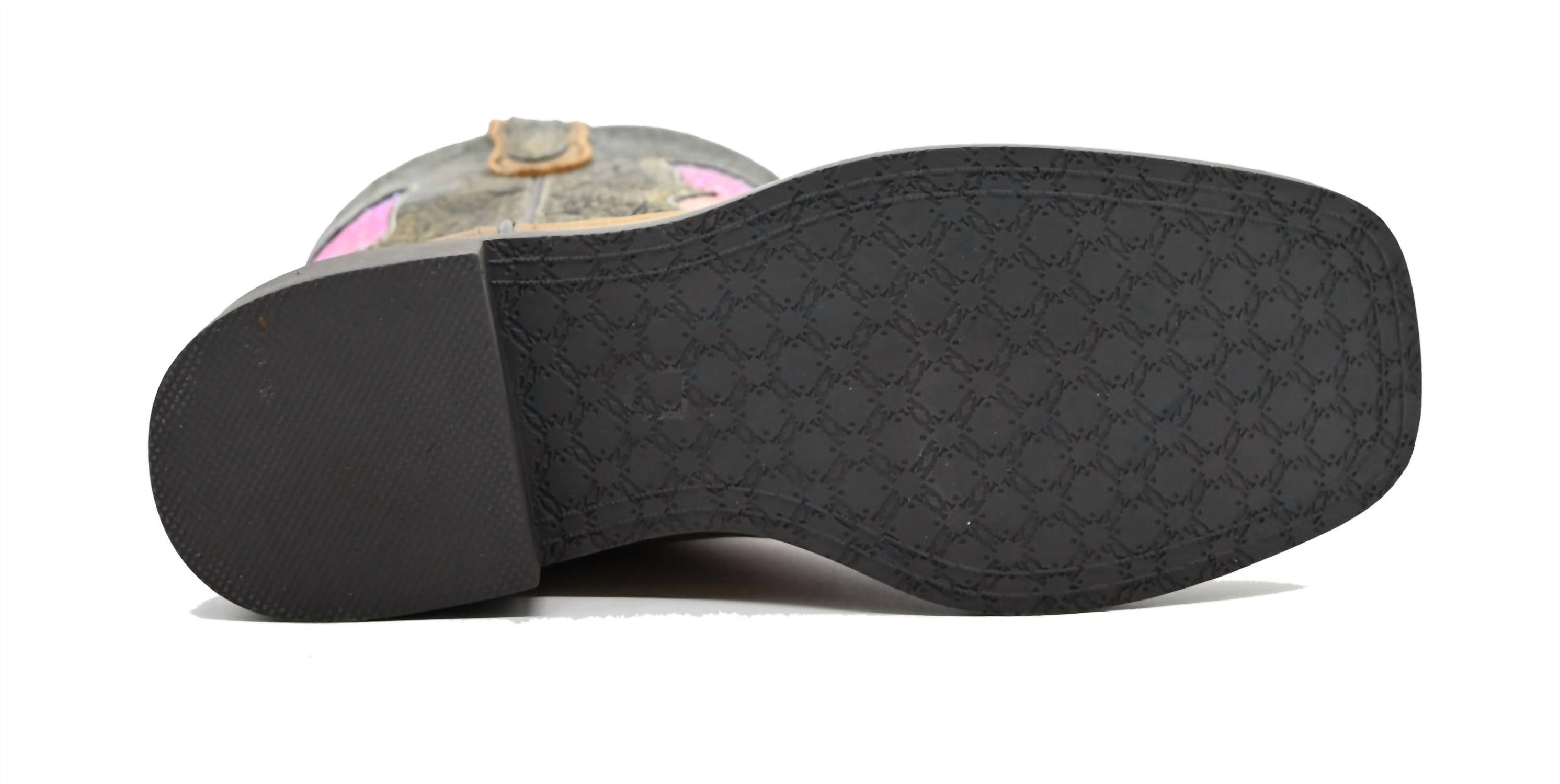 Introduce your little ones to western charm with Smoky Mountain Boots' Kids' Chloe Square Toe Western Boots, crafted from quality leather for durability and comfort. The eye-catching design features a colorful butterfly motif on the shaft, paired with a squared toe and block heel for a classic look. Designed for girls in the playful Brown Distress/Charcoal color, these boots offer both style and function. Let your big kid step into adventure with these essential western boots.