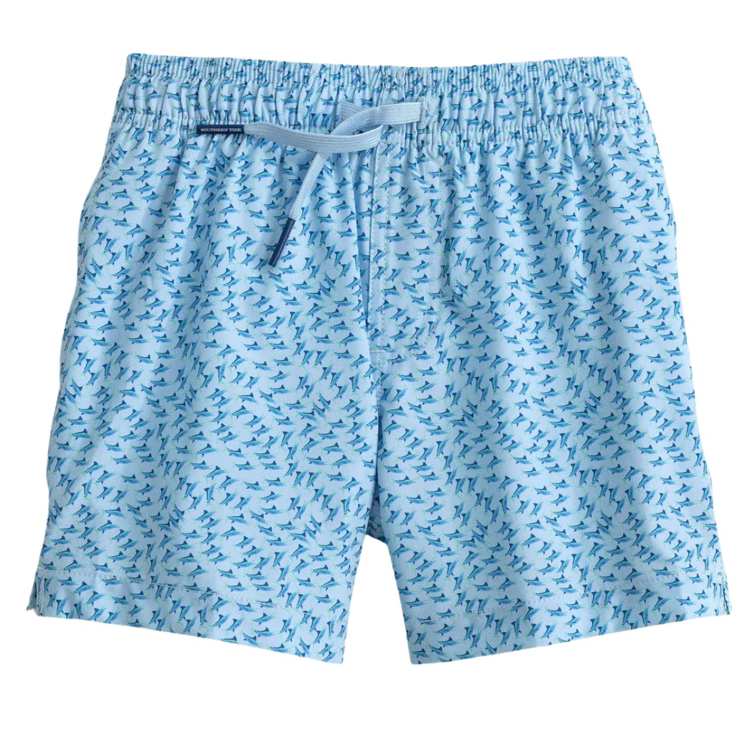 Dive into summer fun with the Boys Fintastic Swim Trunk by Southern Tide, perfect for pool parties and beach days. These trunks boast a vibrant fish-themed pattern in shades of cerulean, crafted from a recycled stretch polyester blend. Enjoy the practicality of a back patch pocket with a Velcro closure and a comfortable fully elasticated waistband. Featuring a faux fly and a micro-mesh brief liner, these swim trunks promise all-day comfort whether in the pool, sand, or sea. Care: Machine wash.