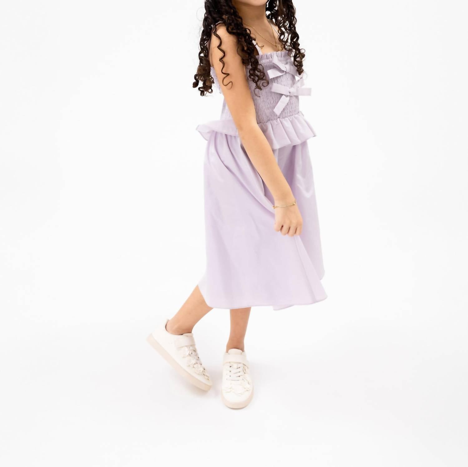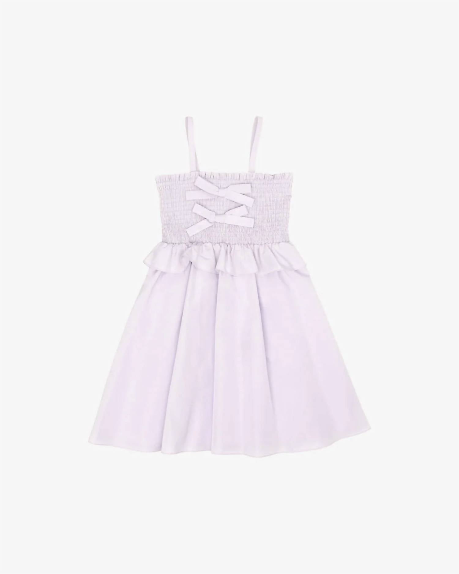 Introducing the Pip Mini Dress by TANYA TAYLOR, a delightful addition to any spring wardrobe in a beautiful lilac shade. This dress features spaghetti straps and a smocked, lined bodice with peplum ruffle and bow details, offering a playful preppy look for young girls. Constructed with 100% polyester taffeta for a luxurious feel, this mini-length dress is designed for easy pull-on wear and is 24" long from the high point shoulder. Care: Dry clean only.