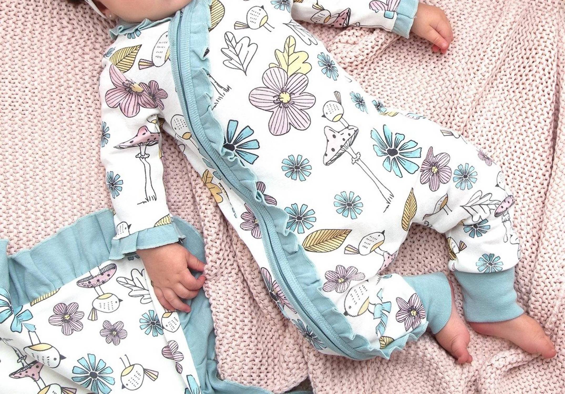 Features whimsical floral and mushroom motifs. Runs alongside the zipper. Asymmetrical ruffle trim. Front zipper. Folded cuffs. Pastel accents.