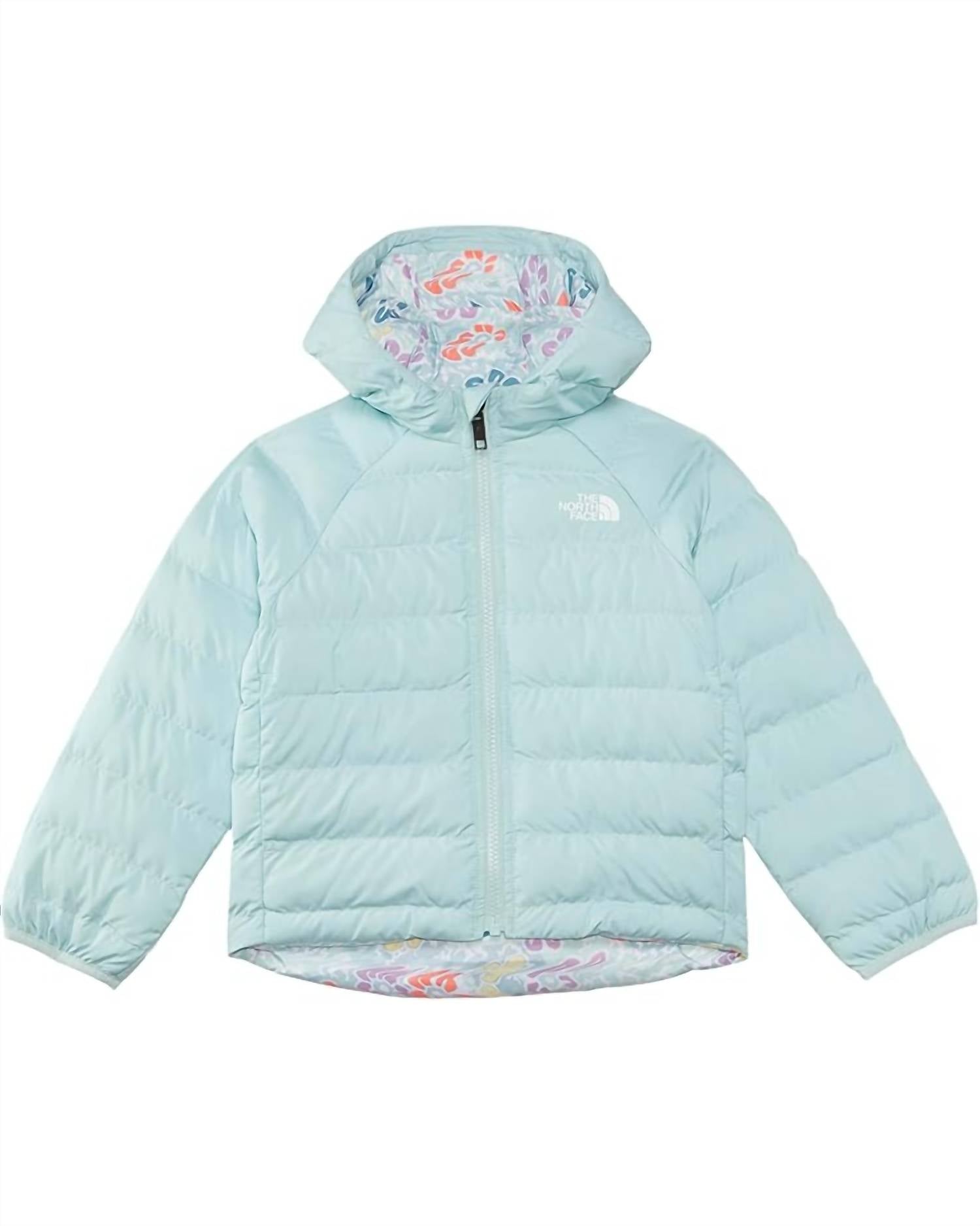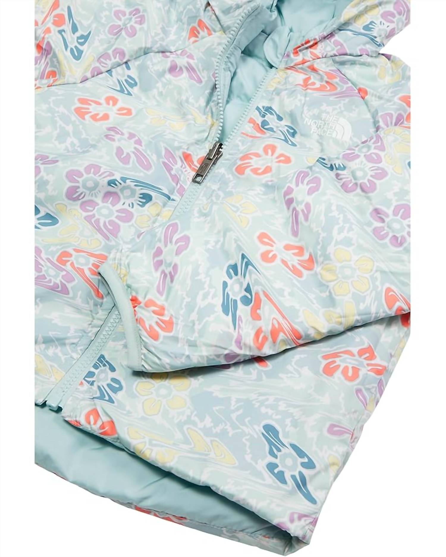 The North Face Kid's Reversible Perrito Hooded Jacket in Muted Pine is designed for winter fun with smart features and style. This floral-patterned puffer showcases practical raglan sleeves and is crafted from recycled polyester with reversible water-repellent properties, ensuring warmth with its recycled synthetic cluster insulation. It includes an attached, three-piece hood, a drop-tail hem, and elastic binding on the hood and cuffs for added comfort. The jacket also features a VISLON® center front zip closure with a chin guard and secure-zip hand pockets, making it perfect for adventure seekers.