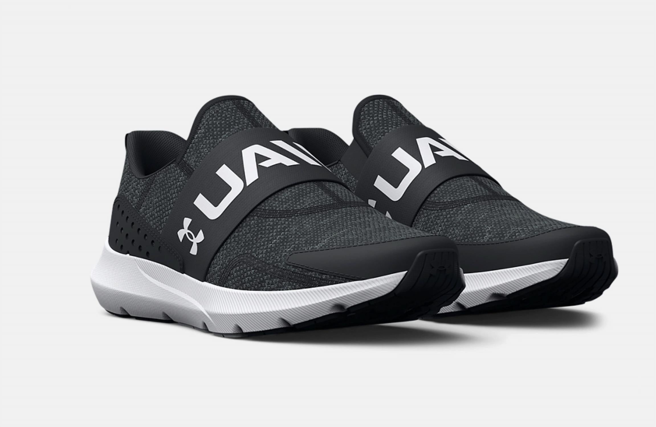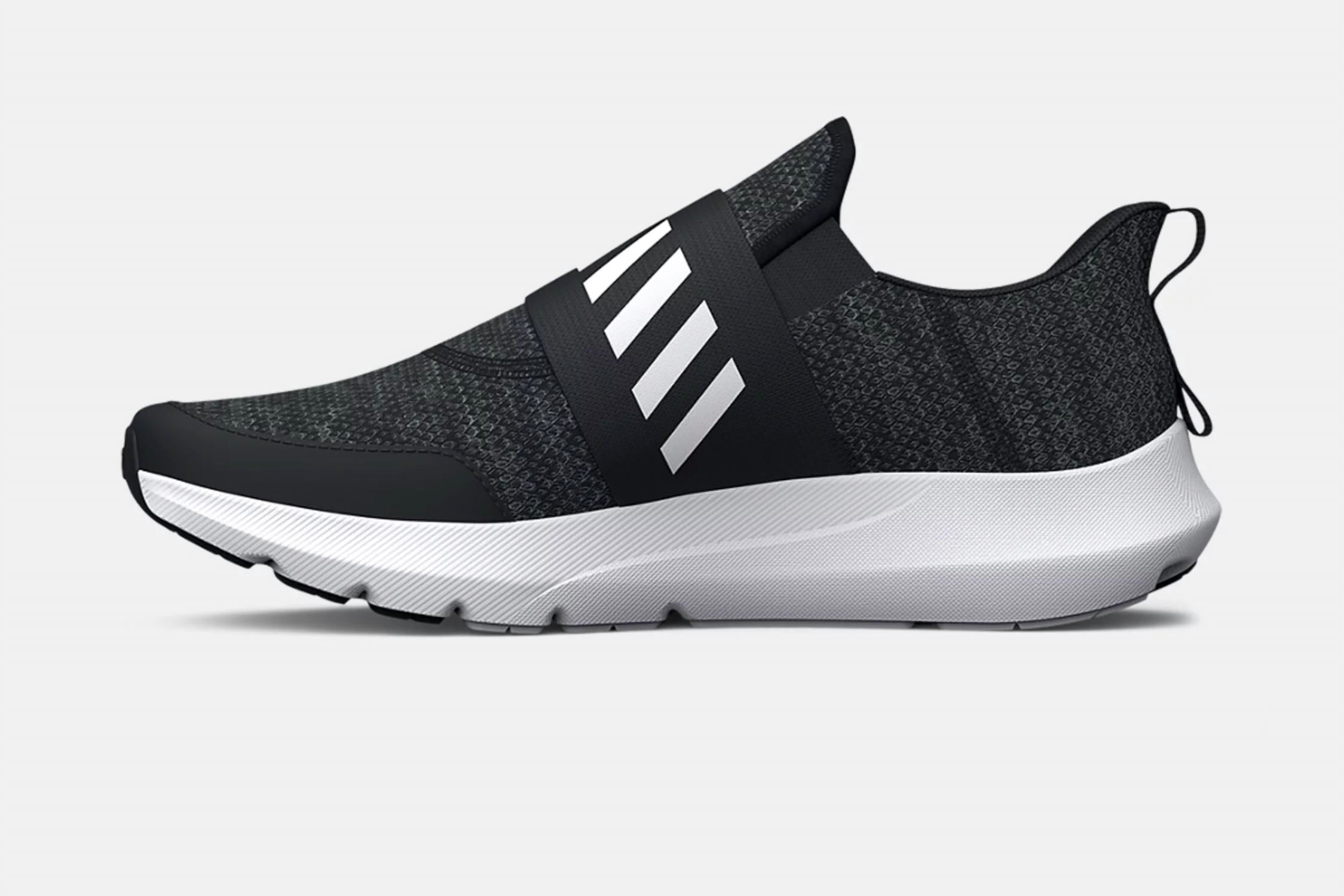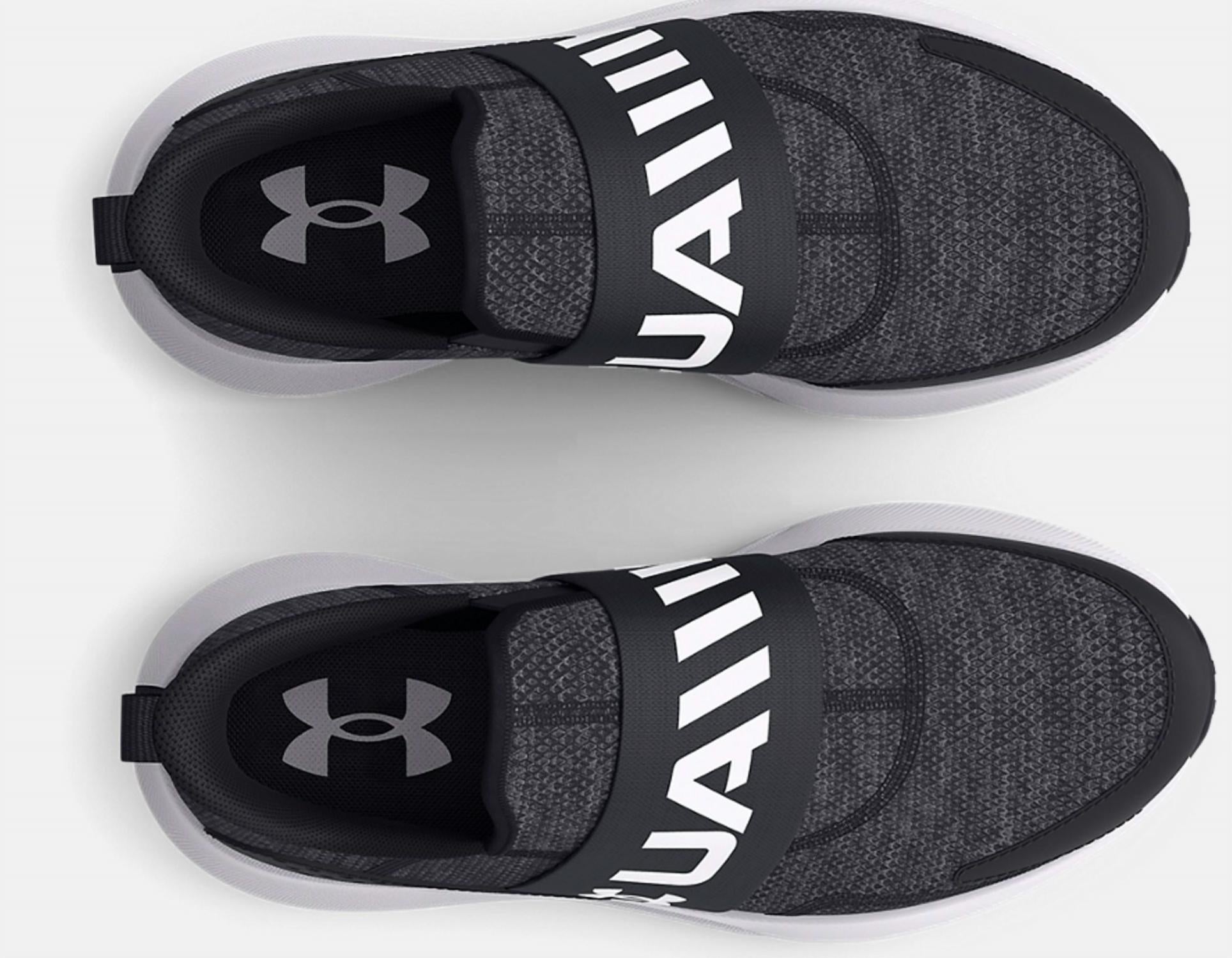 Introducing the Kid's Surge 3 Slip-On Shoes by UNDER ARMOUR, designed for young athletes who value both style and practicality. These sneakers in sleek black feature a lightweight, breathable mesh upper and a slip-on design for effortless wearing. With a flat heel and round toe shape, the shoe includes a TPU heel overlay for durability, a cushioned EVA midsole, and sockliner for comfort. Perfect for athleisure trends and summer fitness activities, these shoes promise all-day comfort and support.
