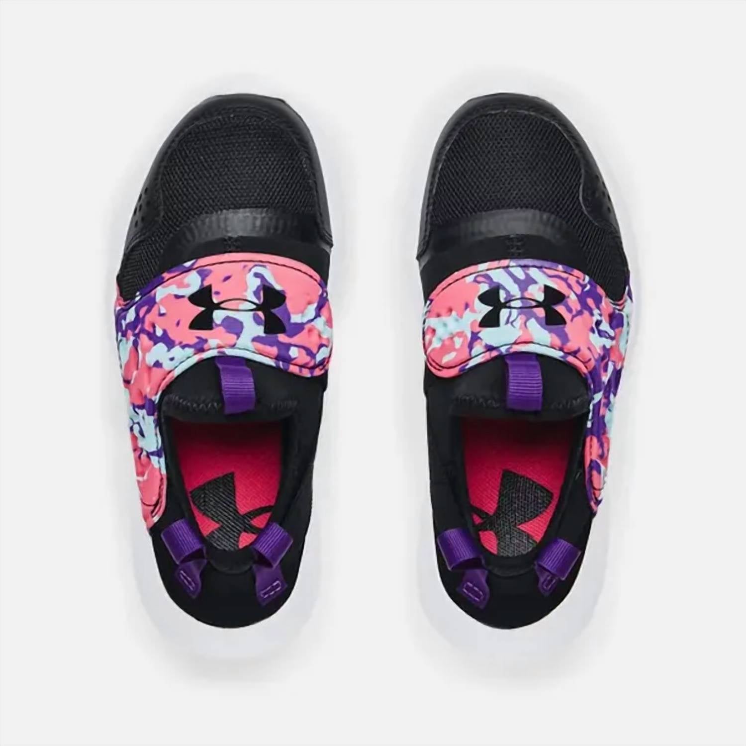 The Little Kids Runplay GPS Shoe by Under Armour combines convenience and functionality for active young ones. Designed in a striking Black Camo color, these sneakers feature a breathable upper with a molded EVA strap for cushioned comfort and a secure fit. The slip-on construction includes double heel webbing for easy on/off and a synthetic toe cap for enhanced durability. Crafted with a 1-piece EVA midsole, these shoes offer lightweight comfort and flexibility, perfectly suited for little explorers.