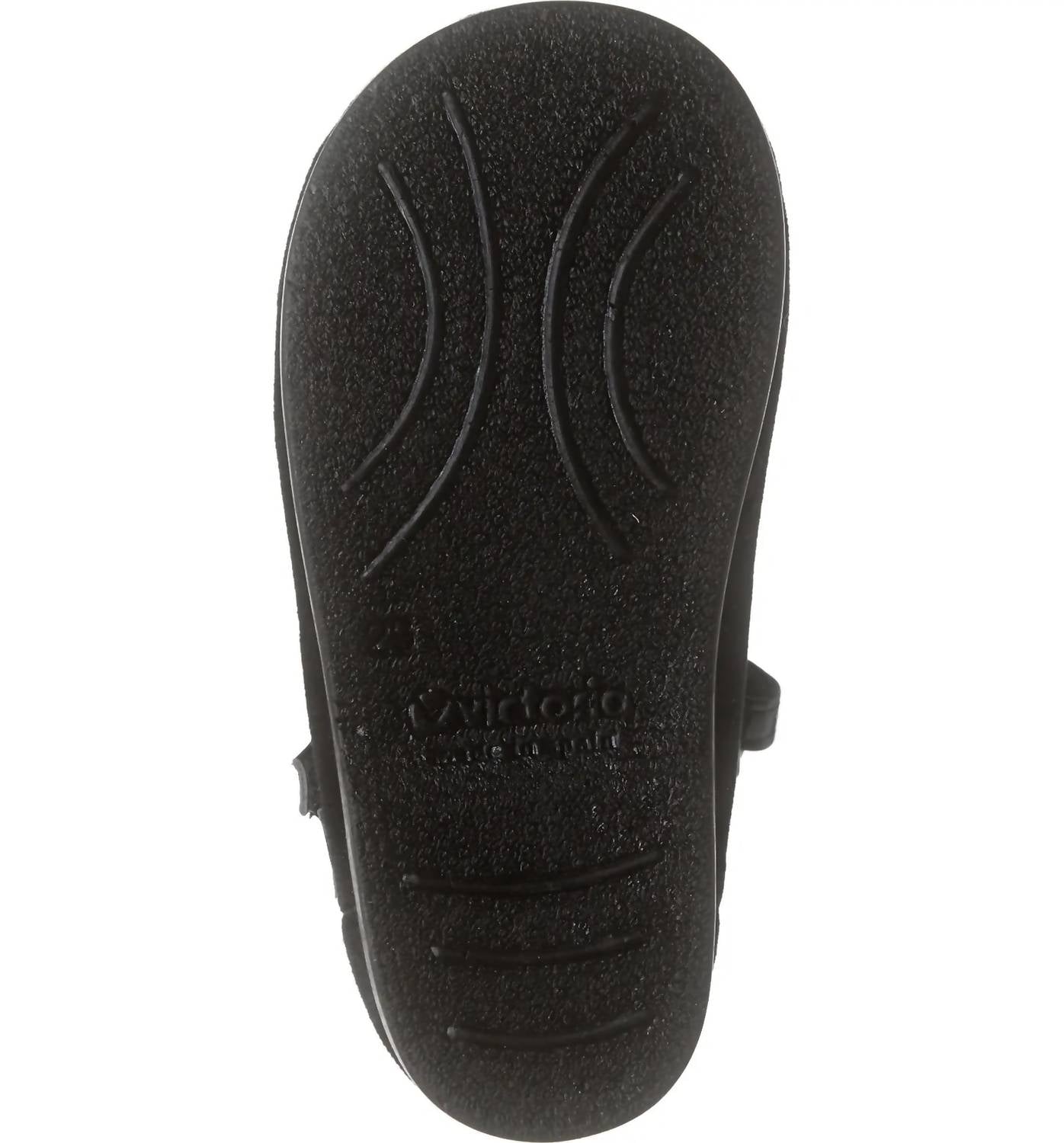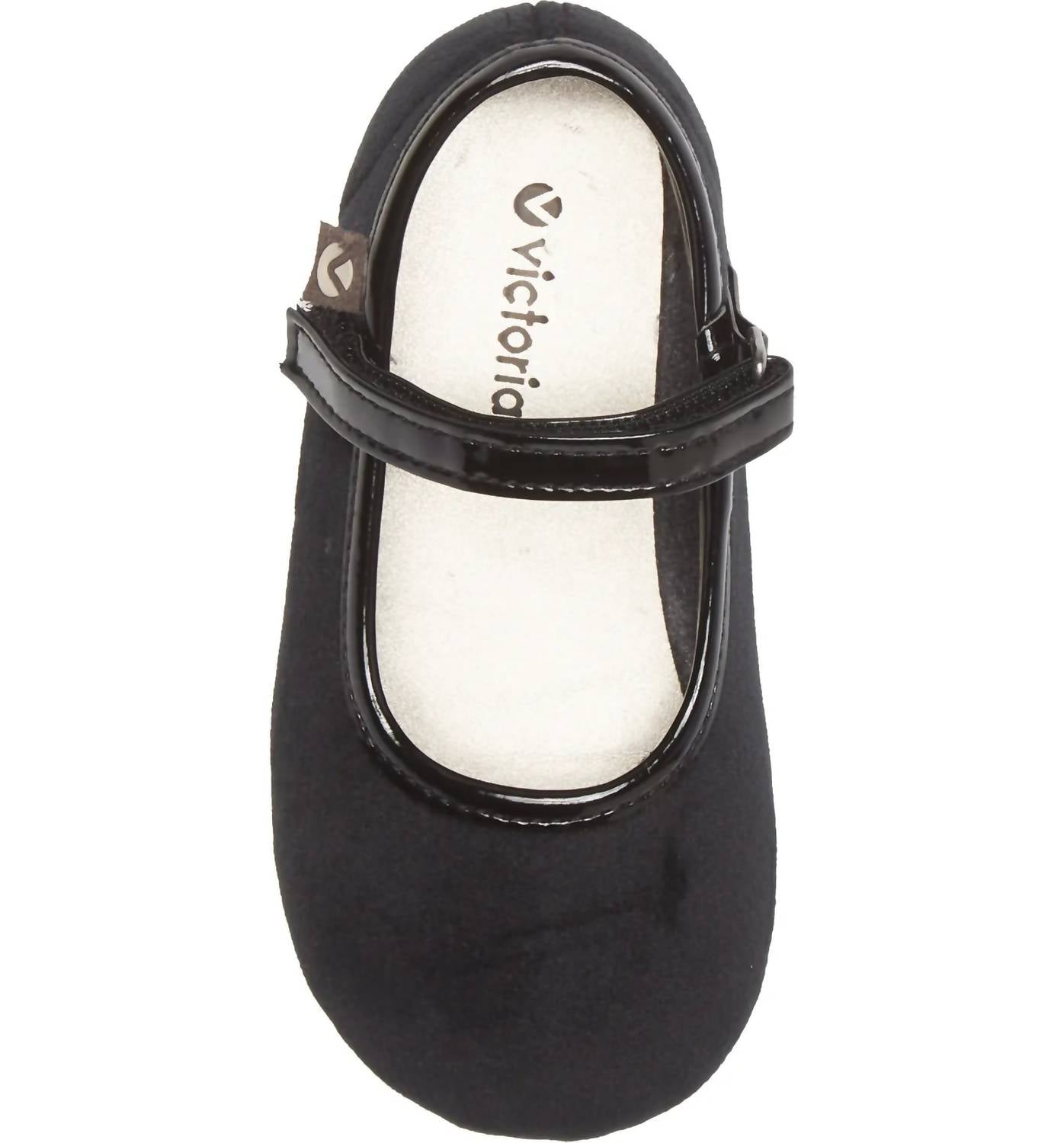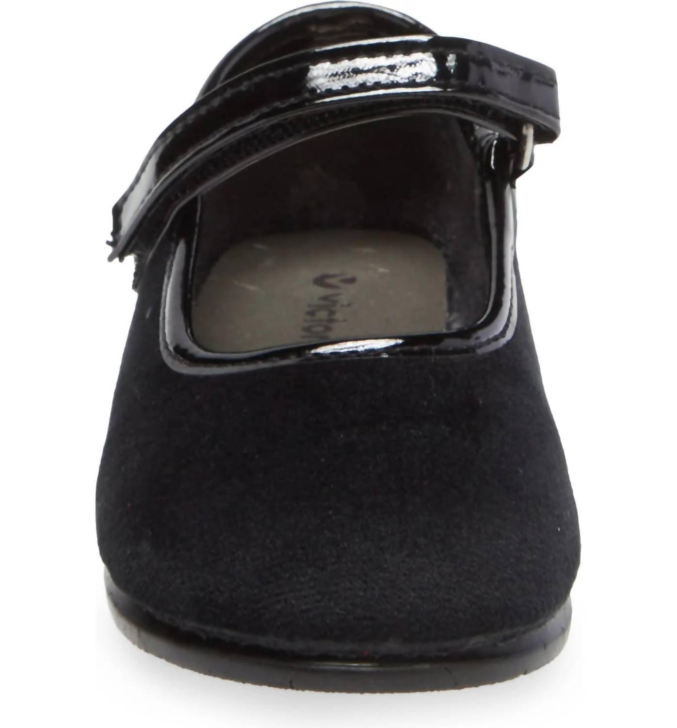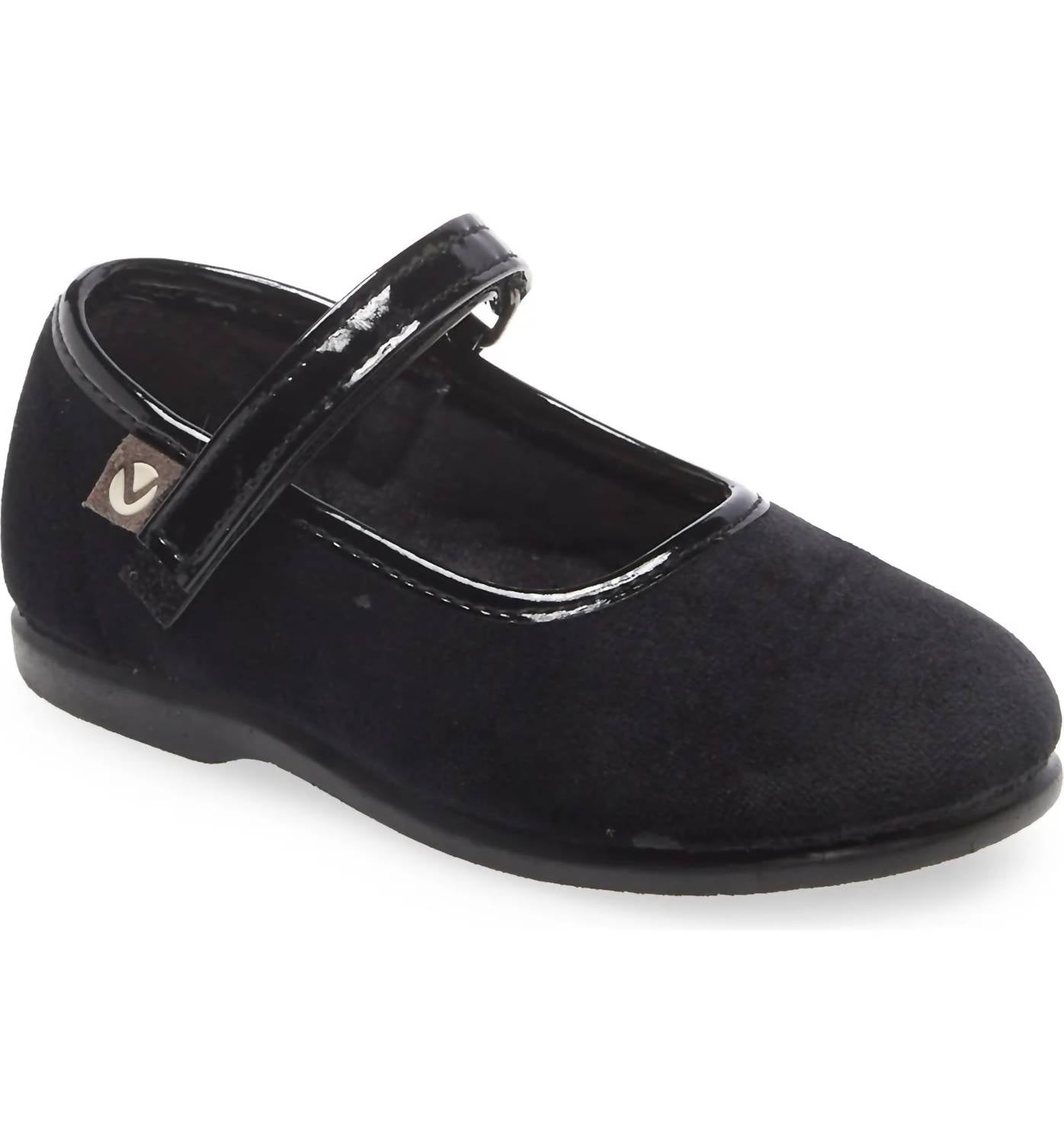 This Velvet Mary Jane for girls with patent details and a strap to make them easier to get on and off. Extra flexible sole in natural rubber sourced from hevea trees. Comes with a comfortable insole. Made on the Spain.