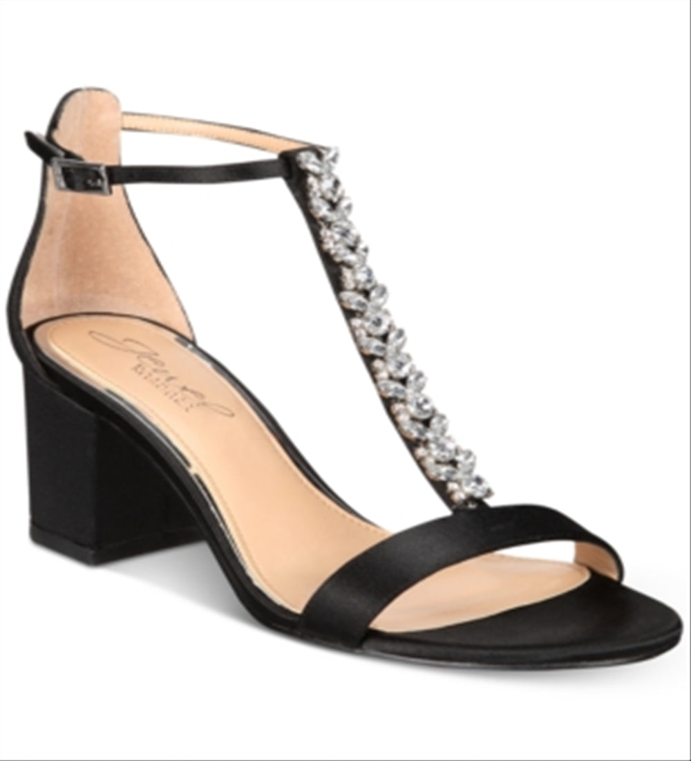 Jewel Badgley Mischka makes an elegant T-strap silhouette absolutely stunning with rhinestones lining up the center of the Lindsey sandals. | Round-toe T-strap sandals; rhinestone embellishments at strap| 2-1/4 covered block heel| Satin upper; manmade sole| Imported
