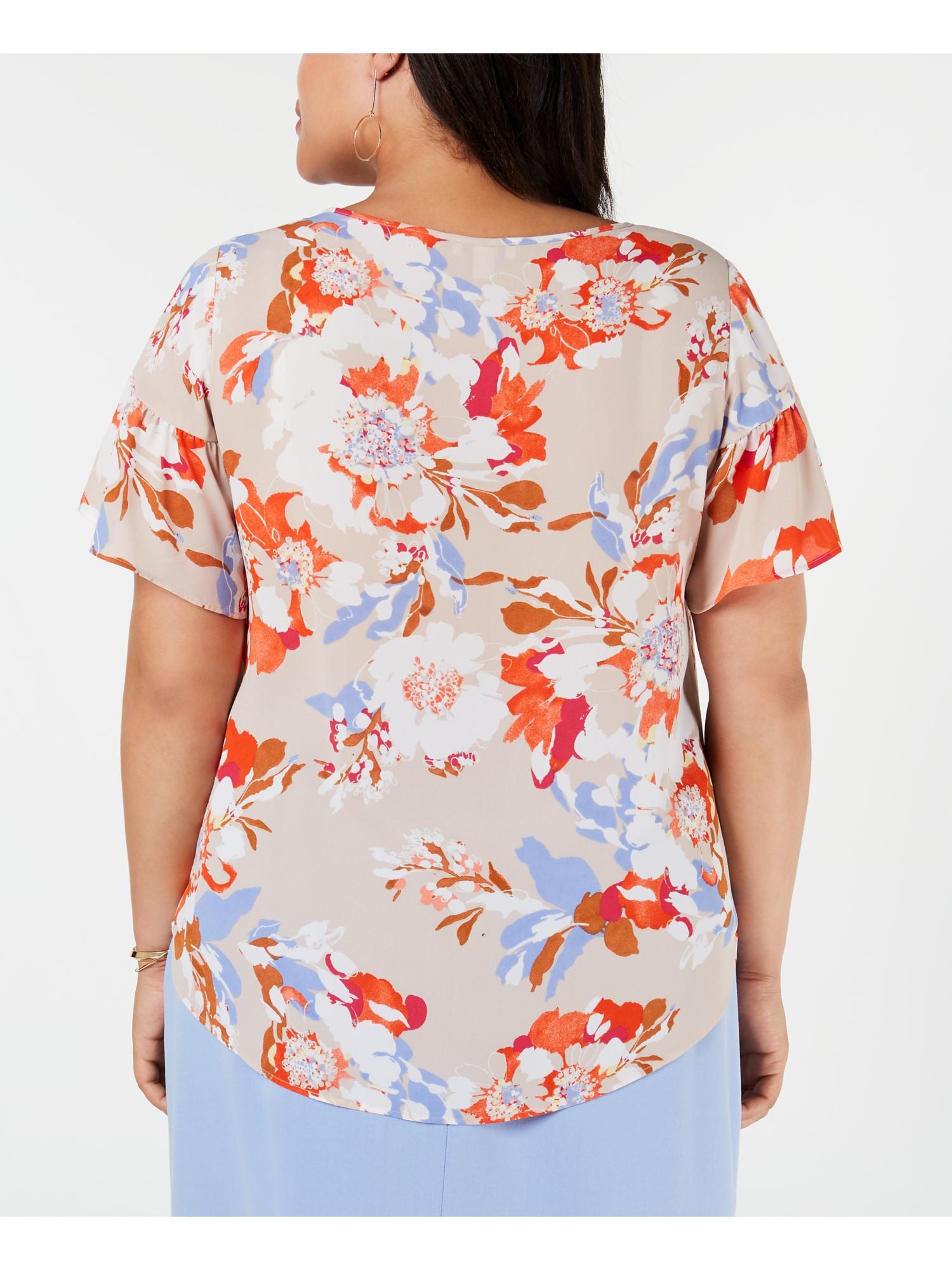 Bar III Women's Floral Short Sleeve Jewel Neck Top Orange Size 1X