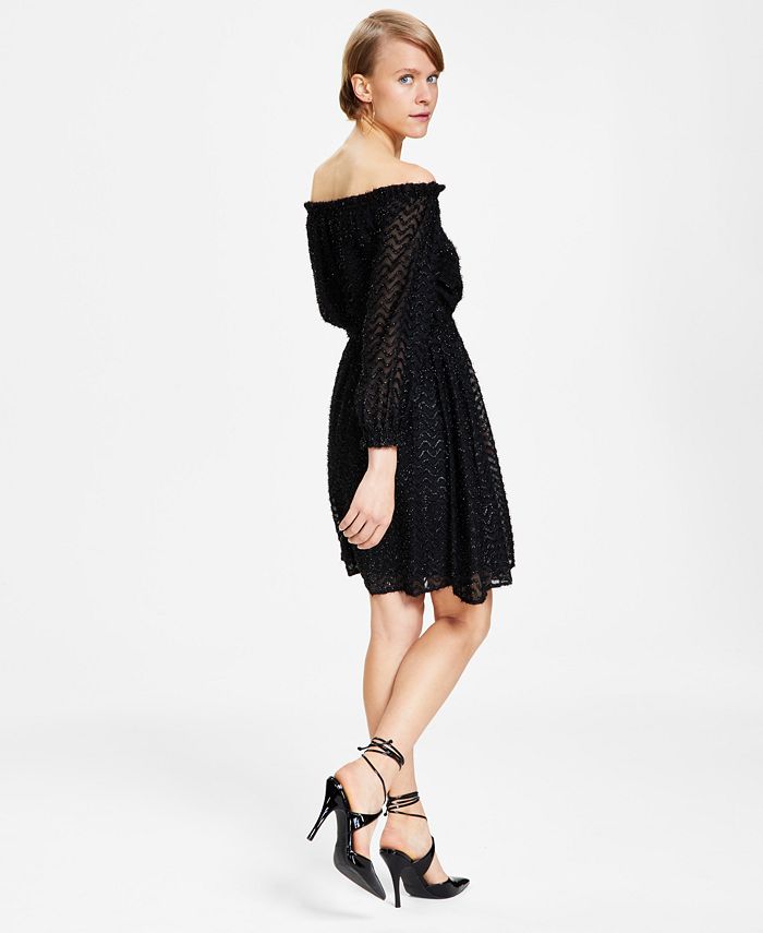 Swirls of sparkly eyelash detail lend endless drama and depth to this chic off-the-shoulder dress from Bar III. A smocked waistline completes the look.| Approx. 34 long from center back neck to hem. Length is based on size M and varies 1/2 between sizes| Fitted through the chest and waist; structured A-line skirt sits slightly over hips| Chiffon; Smooth| sheer woven fabric| Off-the-shoulder neckline; A-line silhouette| Pullover styling