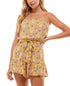 The breezy shape of this Bebop romper is refreshed with sunny floral challis that makes it a bright brunch pick or a light vacay look.| Approx. inseam; 3| Straight neckline| Blouson bodice; tie belt at waist; wide-leg design with hemline ruffles| XS=00/0-1/2| S=3/4-5/6