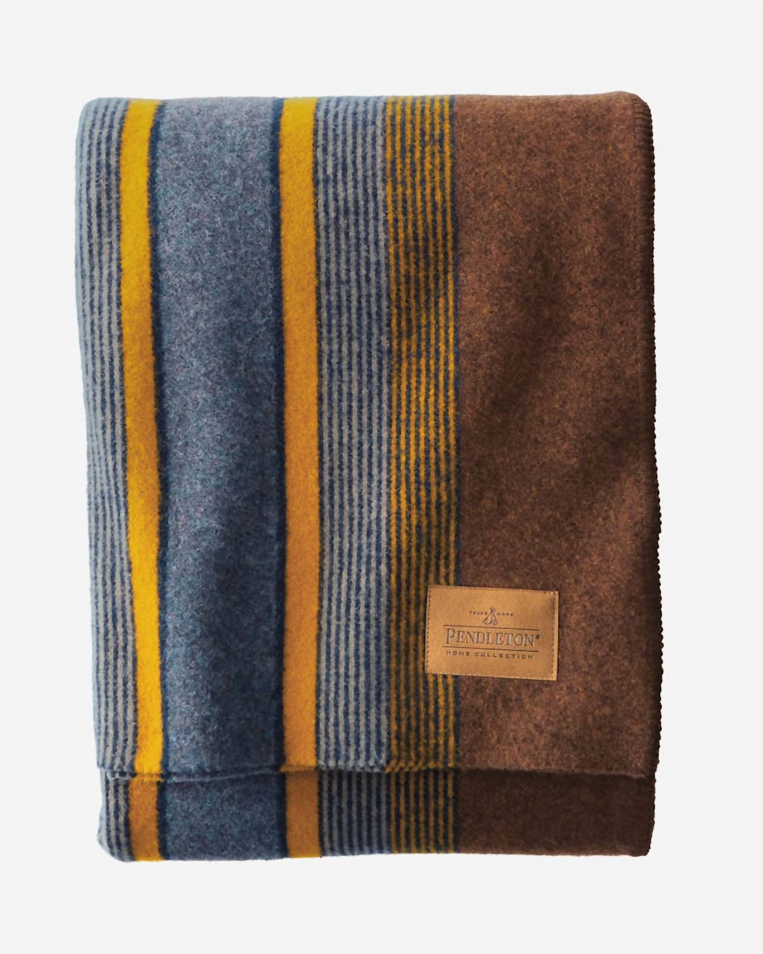 Discover the Yakima Camp Wool Blend Throw Blanket by PENDLETON, a favorite among outdoor enthusiasts and crafted with a nod to its Pacific Northwest roots. This blanket measures 54" x 66" and is made from a luxurious pure virgin wool and cotton blend. Woven with care in American mills, its stripes add a classic touch to any setting. Made in the USA, this throw blanket requires dry cleaning for upkeep.