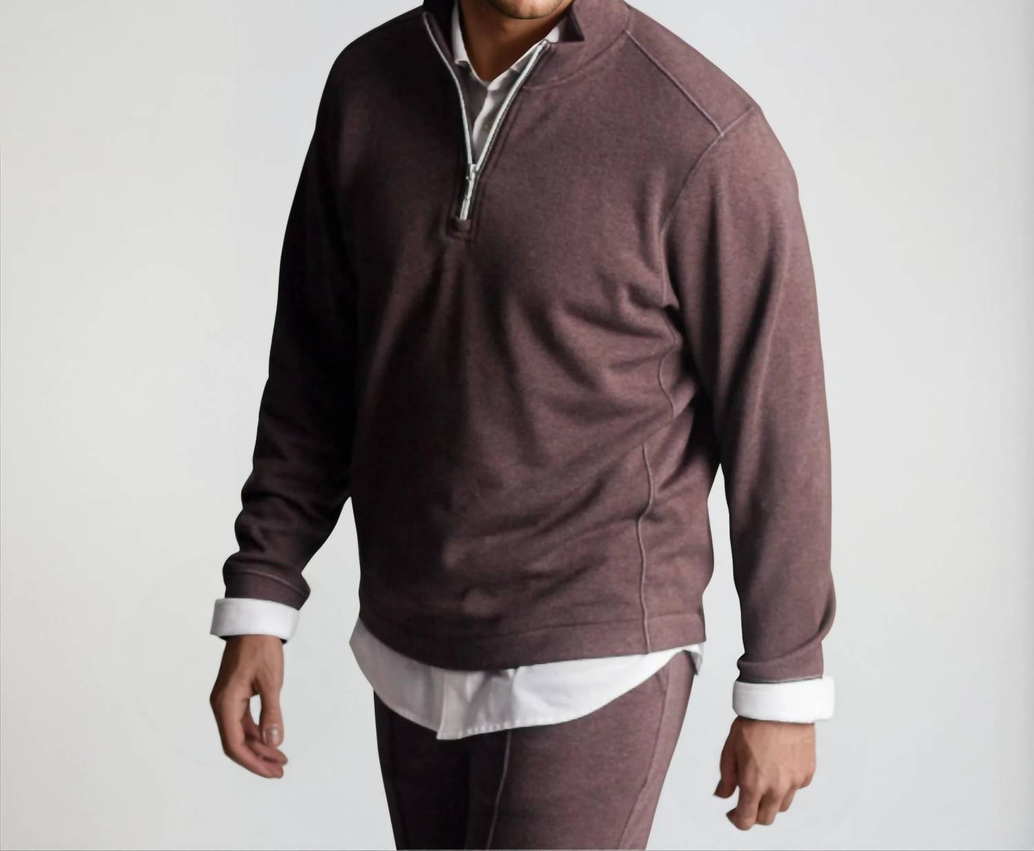 Experience ultimate comfort with the Buki Voey Quarter Zip Sweatshirt in a rich espresso hue, designed for both workweek sophistication and weekend relaxation. This long sleeve pullover features a mockneck and zip closure, crafted from a super-soft Buki Luxe fabric known for its thermo-regulating properties. Ideal for layering, this piece is wrinkle-resistant and engineered for moisture management. This sweatshirt is perfect for fall dinner parties and active lifestyles alike.