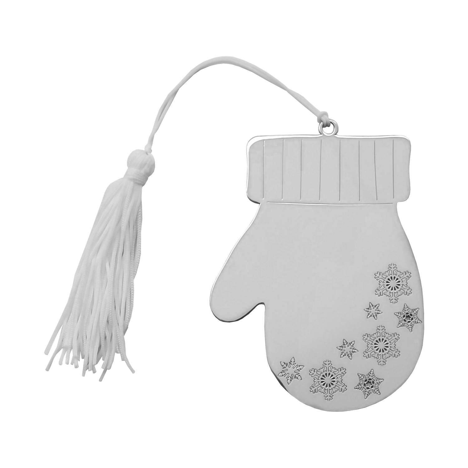 Crafted from premium stainless steel, this ornament features intricately engraved snowflakes on both sides, creating a captivating winter wonderland effect. The white tassel at the top adds a delicate, festive touch, making it a perfect gift or a charming addition to your tree. Plus, it can be personalized with engraving to add a special touch. 3.75" H x 2.75" W. Material: Non-tarnishing Nickel Plate. Presented in a white box.