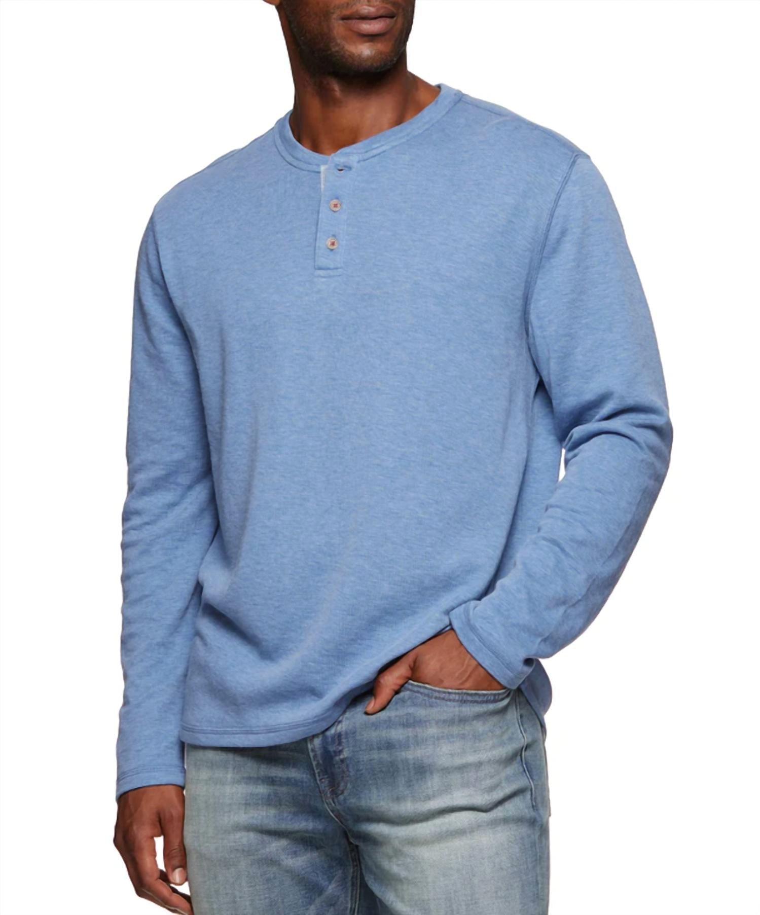 Introducing the Bridgeport Double Knit Slub Henley Tee by Flags & Anthem, a solid medium blue staple for every man's wardrobe. Featuring long sleeves and crafted from a durable Cotton Blend (59% Cotton, 41% Polyester), this tee offers both comfort and style with a tailored athletic fit. Its classic three-button front placket closure nods to its workwear roots, ensuring versatility when paired with joggers or jeans. Imported and machine washable, this tee measures 28.5" in length from the highest shoulder point for size medium.