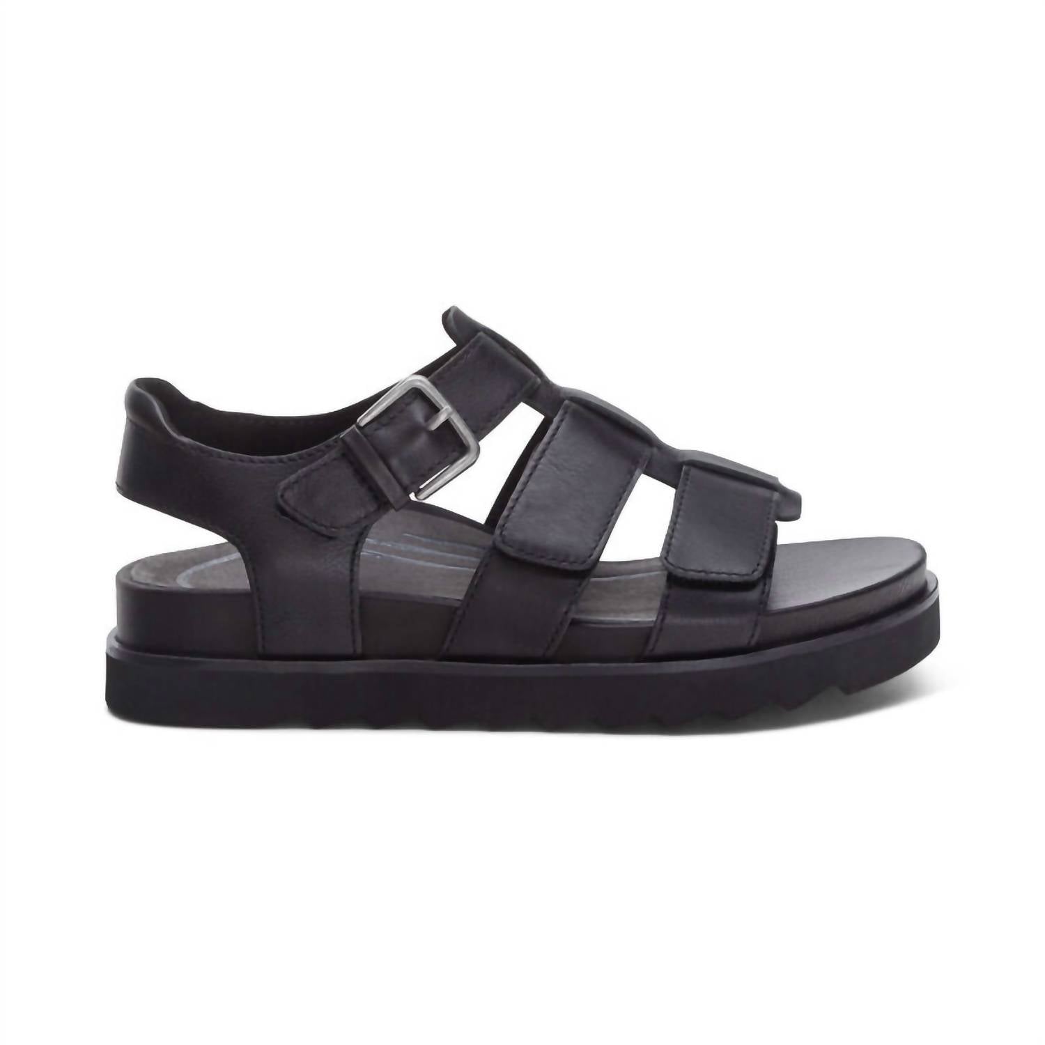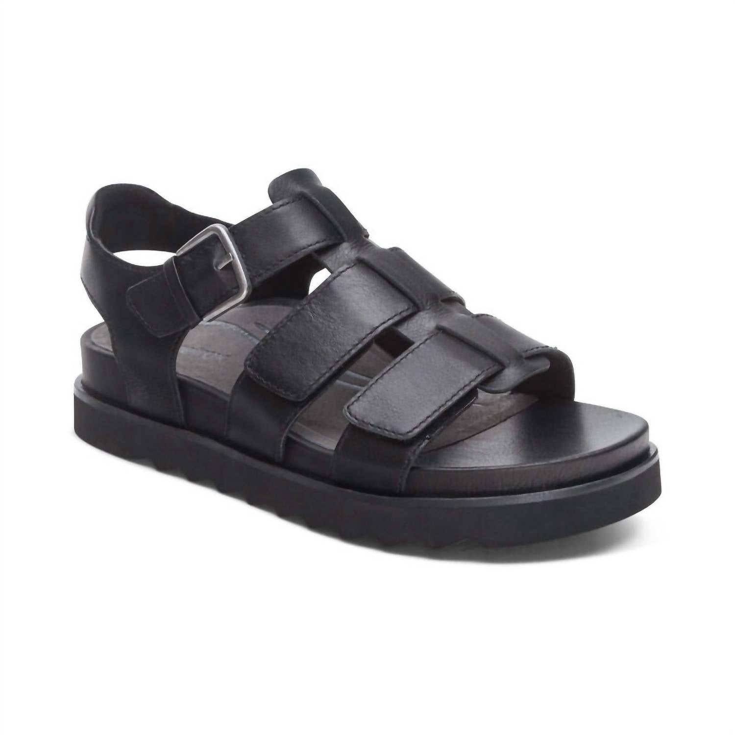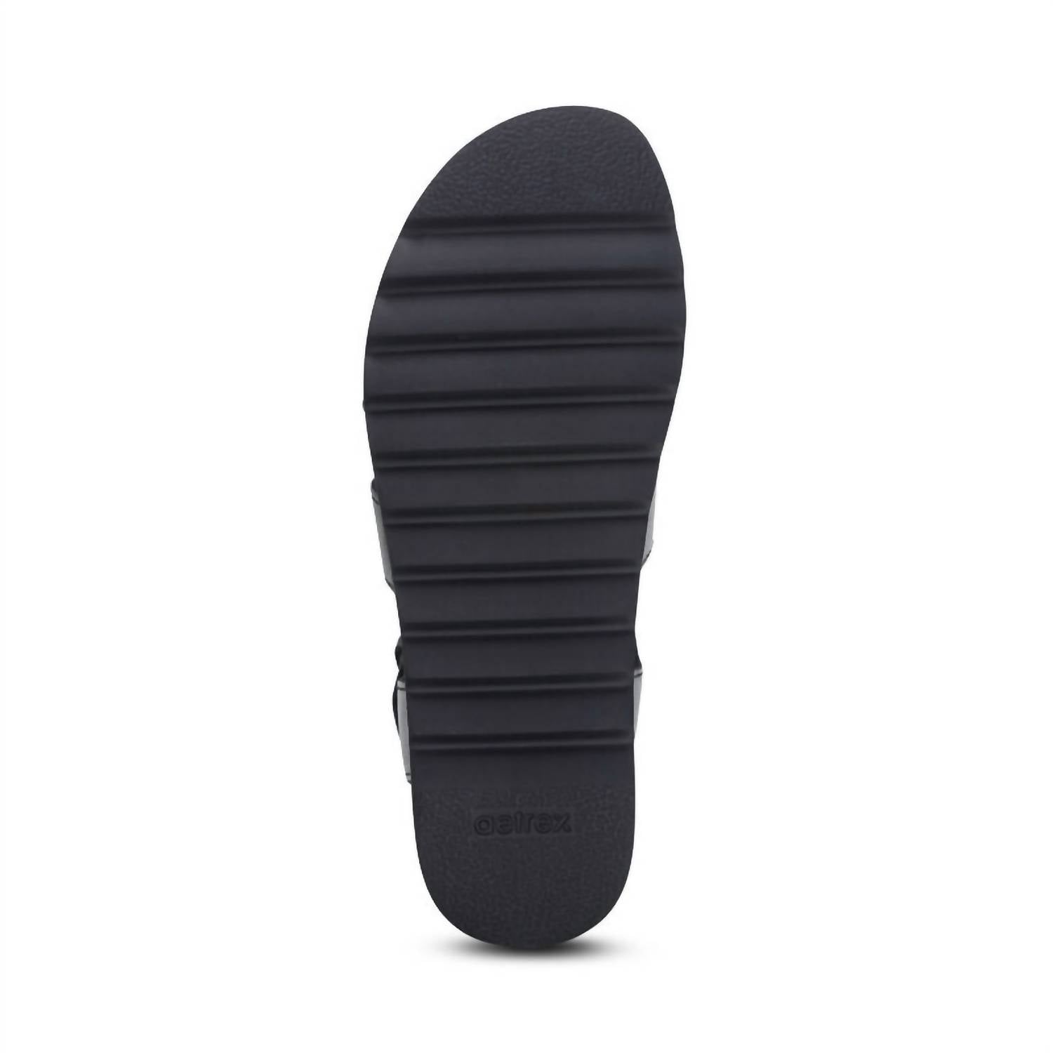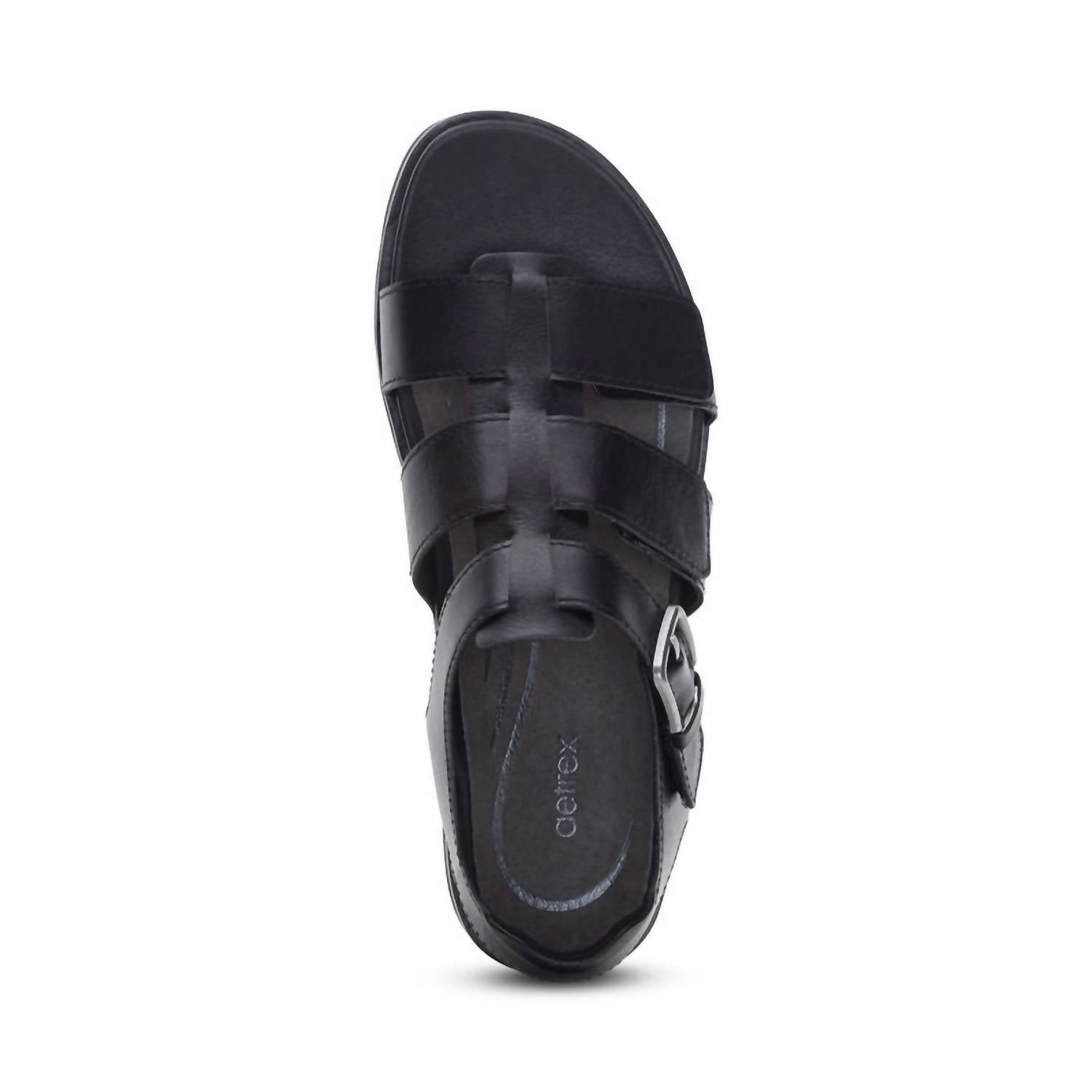 This sandal will take you from brunch to dinner and everything in between. Step up your resort wardrobe with the Aetrex Women's Romy Hook & Loop Sandal, a blend of fun and luxury in versatile black. Featuring a fully adjustable quarter strap and hook & loop closures, these sandals ensure a tailored fit for every foot. Crafted with a leather upper and footbed for lasting durability, complemented by a rubber sole for superior traction, they offer unrivaled comfort. With a low 1.5" flat heel and built-in orthotic support, the Romy Sandal is your perfect summer companion for stylish vacations or Mother's Day gifting.