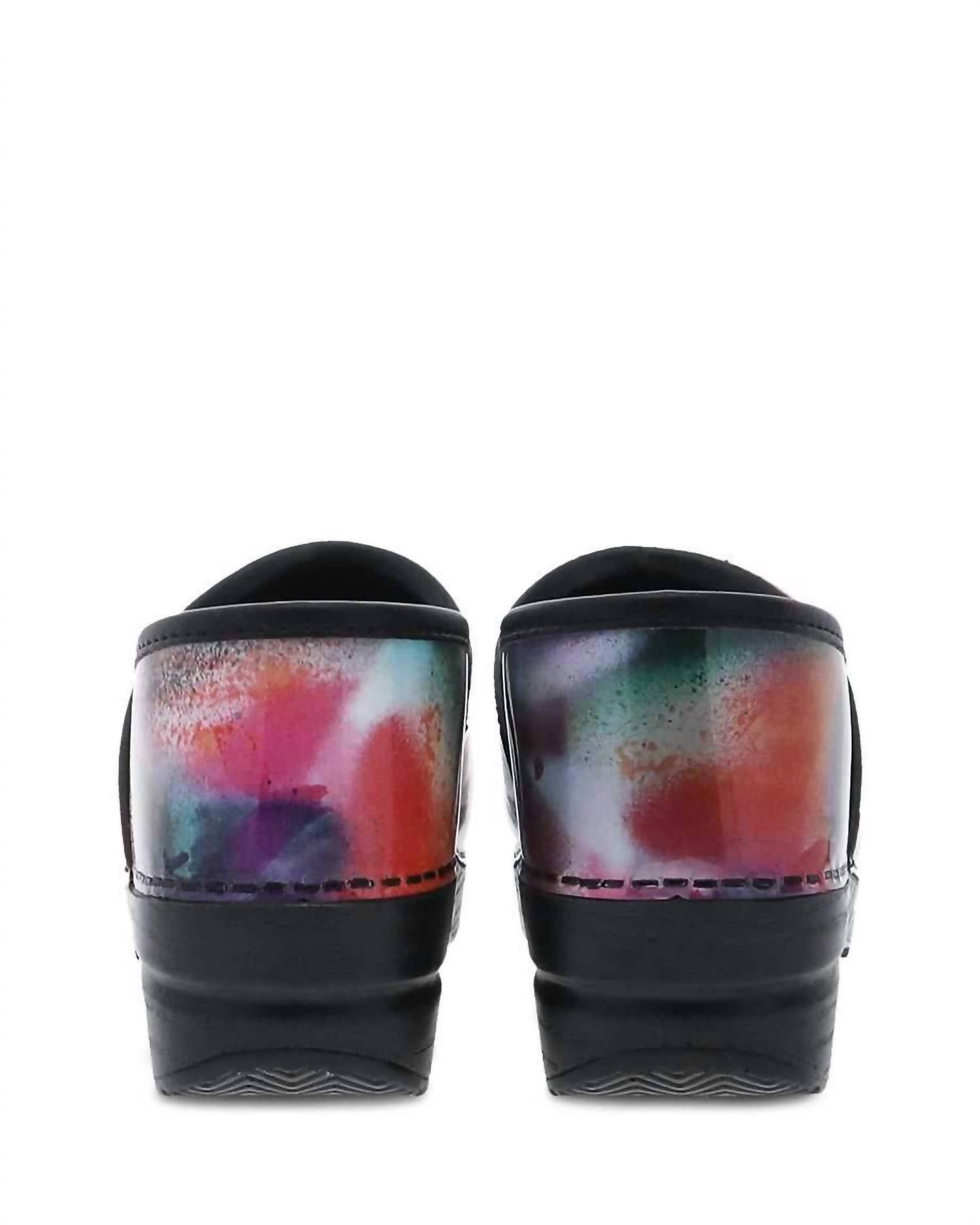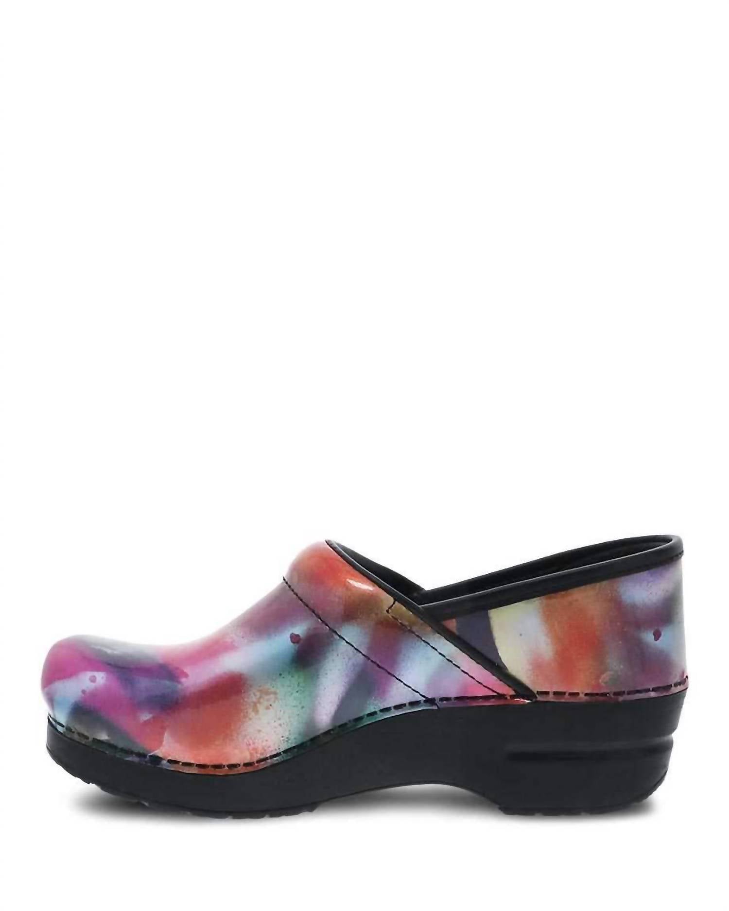 Stylish, comfy, and versatile. We can't find anything wrong with these. Step out in style with the Women's Professional Patent Spray Paint Mules by Dansko, combining maximalist flair with practical comfort. Designed with leather uppers and a roomy round toe box, these mules offer all-day ease with a padded instep collar and slip-resistant rubber outsole. The removable dual density PU footbed and TPU arch stabilizer ensure exceptional support, while the lightweight EVA midsole enhances stability and shock absorption. With a heel height of 1.75", these clogs are perfect for vacations and everyday wear, effortlessly suited for diverse surfaces.