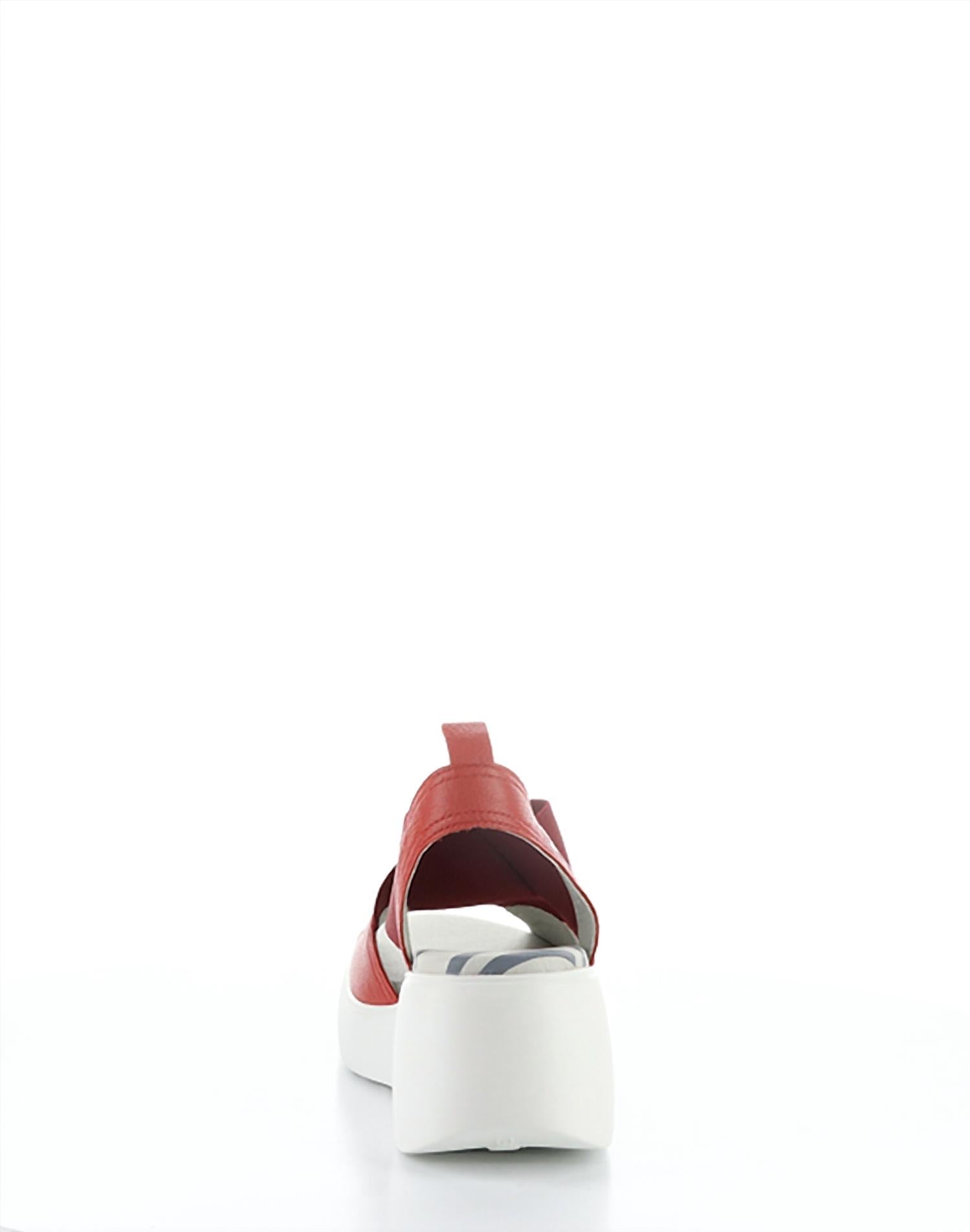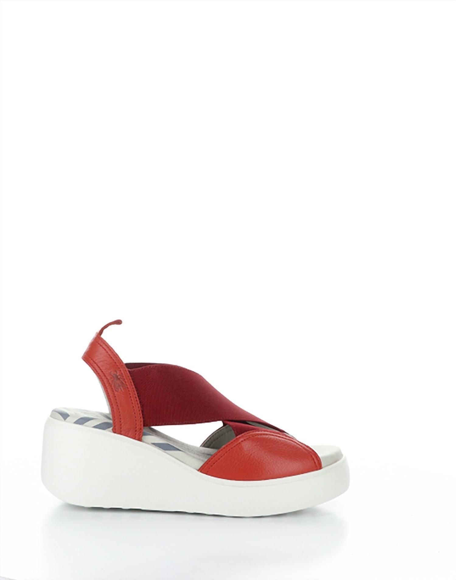 Elevate your footwear game with these adorable wedges. Step into style and comfort with the Women's Daif Sandals by FLY LONDON, a standout from the DAZE-S line. These Devil Red sandals feature a lightweight rubber wedge sole with a mid heel height of 2.5 inches, complemented by a 1-inch forepart for added comfort. Crafted with leather uppers and linings, they offer a snug fit through criss cross elastics, providing a chic open toe design. Made in Portugal, these pull-on sandals are perfect for both streetwear and special occasions like Christmas and Game Day.