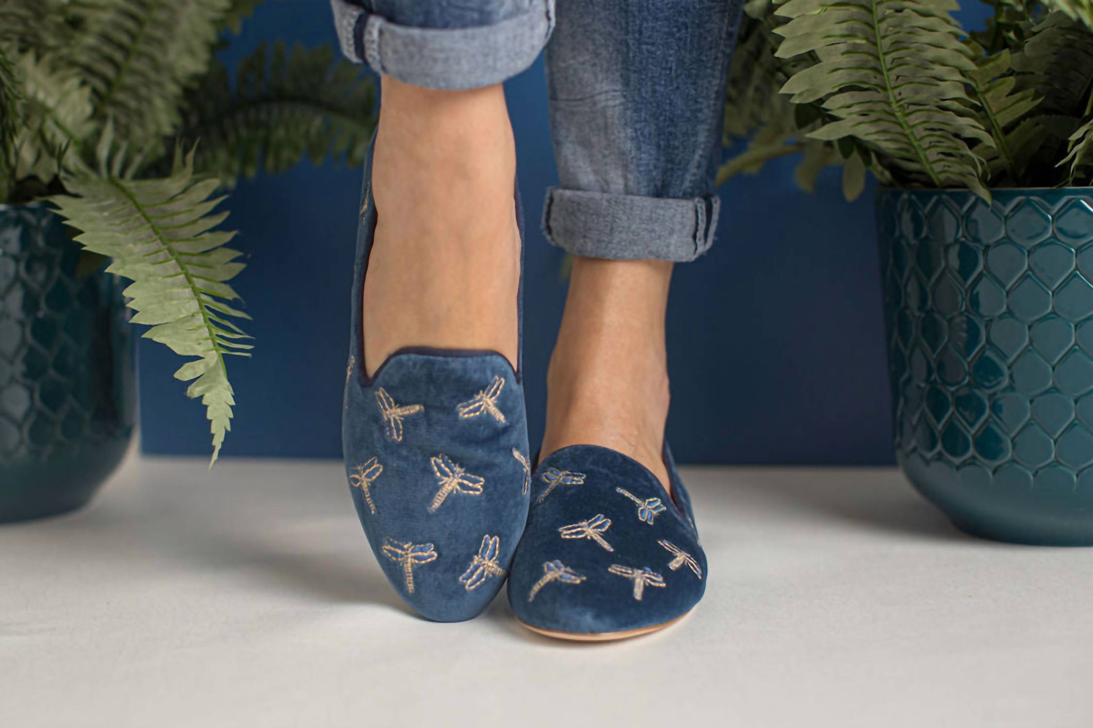 So comfy it's like you're walking on clouds. .75 inch Leather Stack Heel. Dragonfly slipper features rich Blue Smoke Italian. Cotton-Velvet and matching grosgrain trim with our whimsical Dragonfly embroidery. Napa Leather Lining for additional support and comfort. Leather Sole. Velvet treated to be water repellant