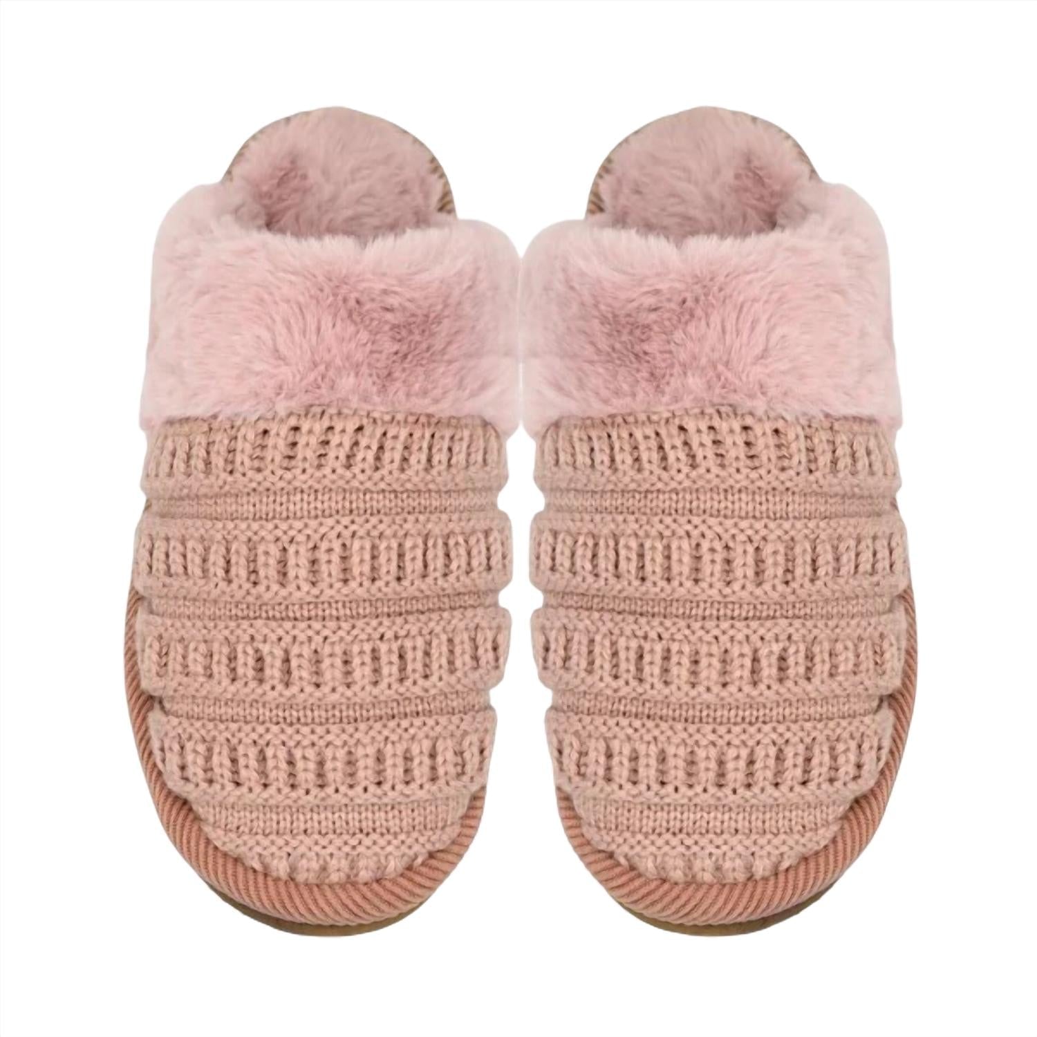 So comfy it's like you're walking on clouds. Introducing the Ribbed Pattern Knitted Slippers by Judson & Co., a cozy choice in an elegant blush pink. Crafted with a shell of 100% acrylic and lined with faux fur made from 100% polyester, these slippers promise comfort and warmth. Specially designed for US Women's sizes S/M (6-8) and M/L (8-10), they feature a round toe design perfect for any lounging session. Ideal for adult women, these slippers blend style with plush coziness.