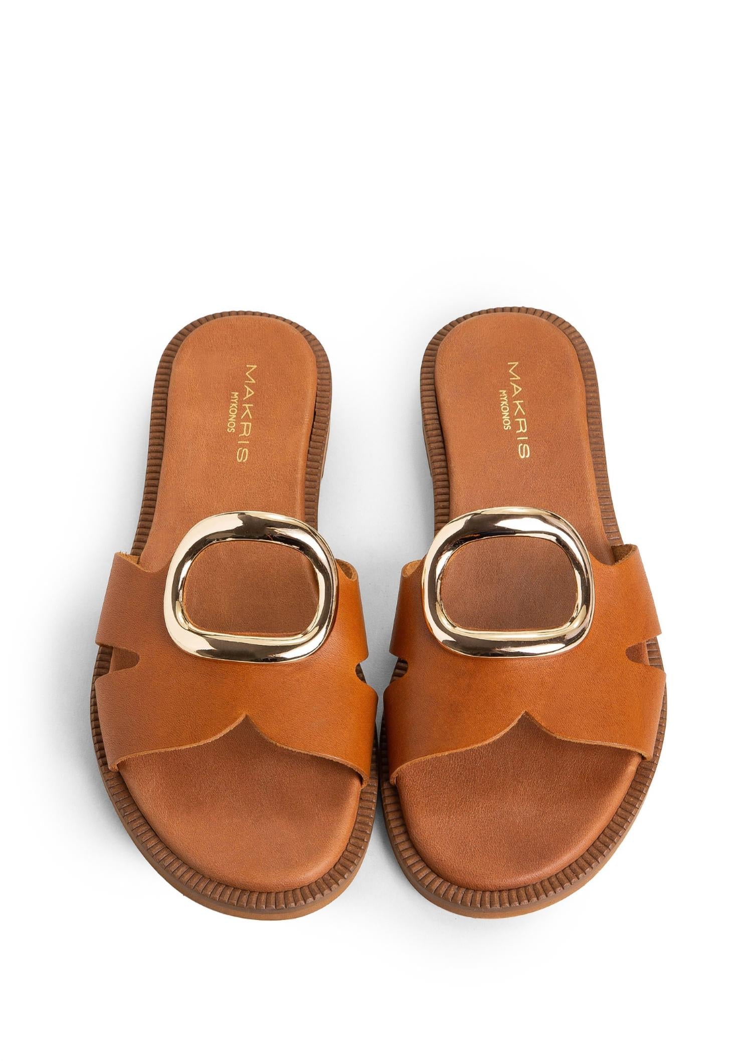 Flowy dresses, cropped pants, and even jumpsuits... this sandal works with them all! Introducing the Women's K Two Sandal by Makris, a Boho Chic essential in an elegant Ancient Camel hue. These taupe sandals feature a flat heel with a heel height of 1 cm, perfect for vacation wear. Crafted from high-quality leather, they boast an open-toe design with golden details, ensuring a true fit for medium-width sizes. Ideal for your summer wardrobe, these sandals blend style and subtle luxury effortlessly.