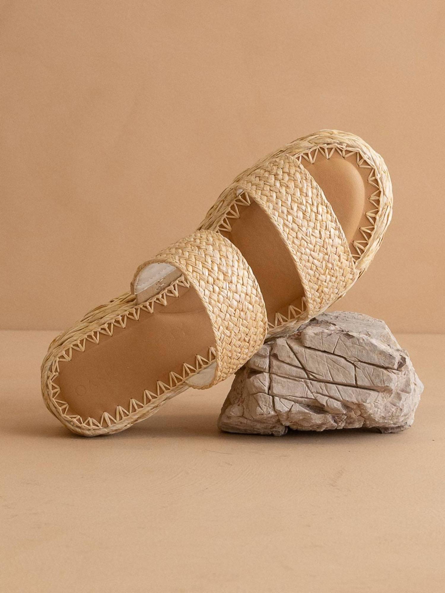 Slip into these, we promise you won't regret it. Introducing the Marley Basket Woven Double Strap Platform Slide by Oasis Society, an exquisite fusion of elegance and ease. Designed with atelier-selected raffia upper straps and completed with a DreamCloud cushioned insole, this slipper promises supreme comfort. Heel Height: 2", Front Platform: 1.5". The rubber sole exemplifies quality craftsmanship with its sturdy espadrille style. Effortlessly embrace style and comfort with these women's platform slides in a natural hue.