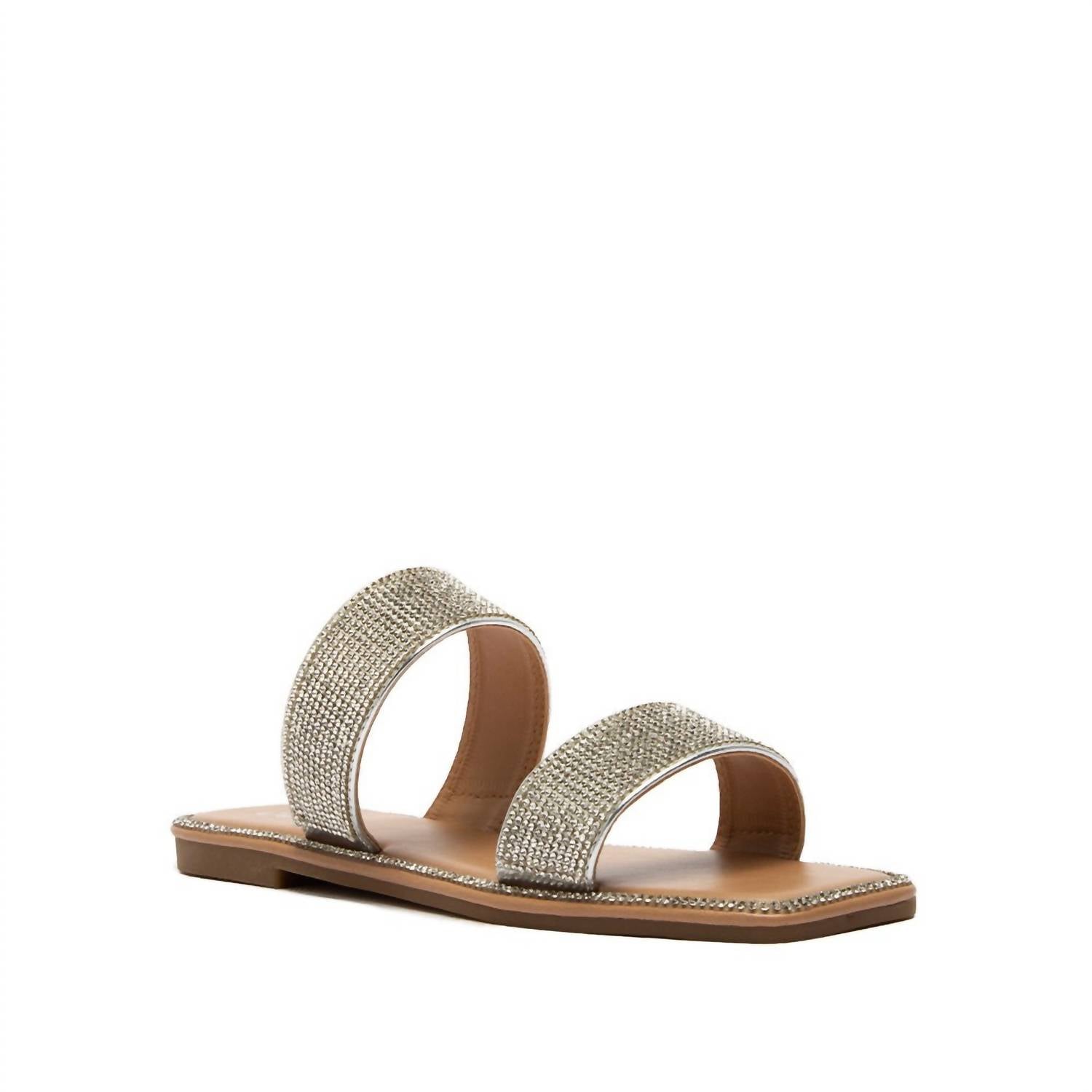 Classicly cute and all-day-wearable. We love this sandal. Step into style with the Women's Rhinestone Band Slide Sandal by Qupid, designed to add a touch of shine to any ensemble. Available in a sleek silver hue, these sandals boast an open toe and flat heel, ensuring both comfort and flair. Embrace casual elegance with every step, perfect for warm-weather outings and beyond. Note: Ensure you select the correct size as this item is a final sale.