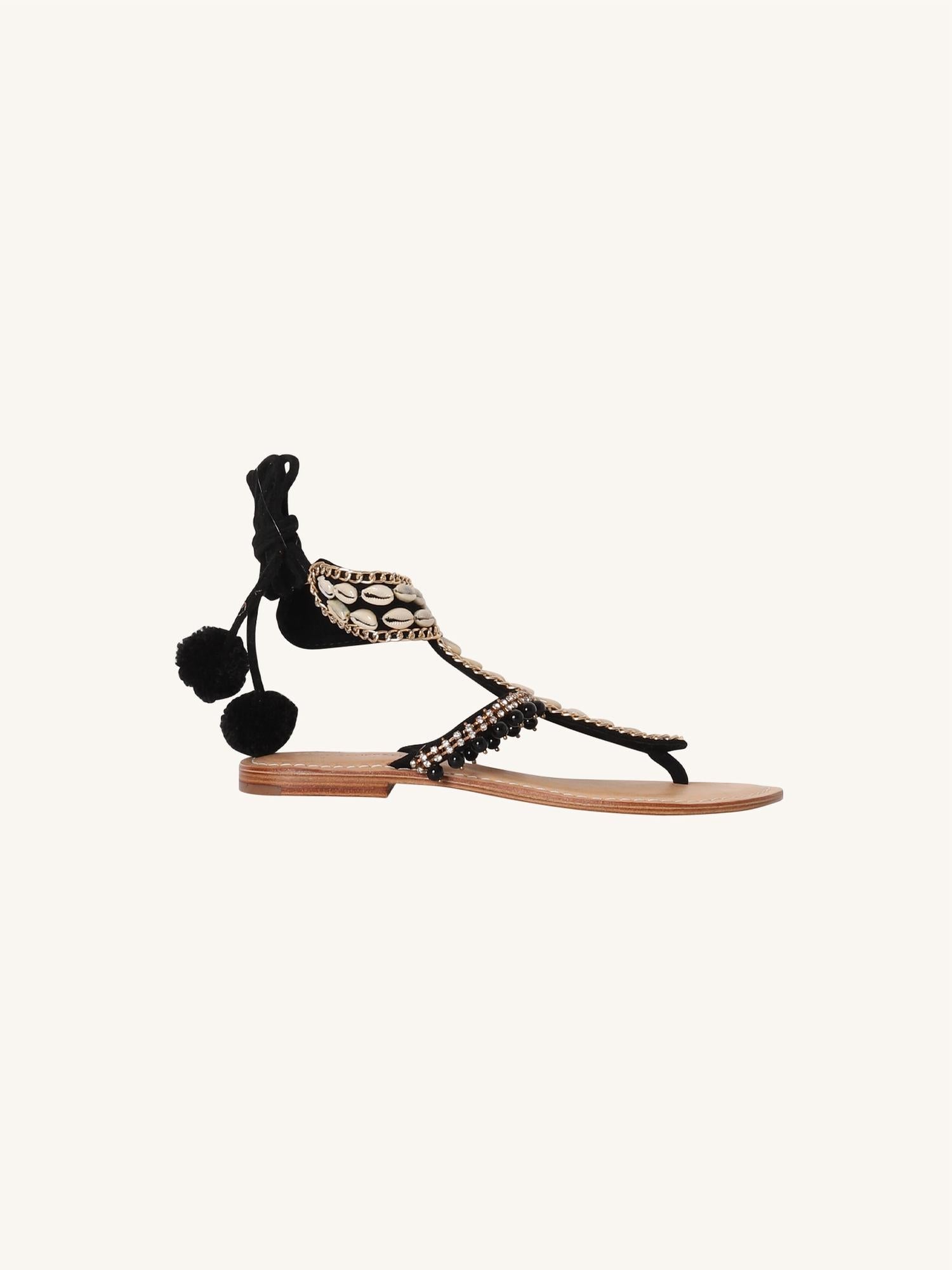 Step out in style with the Silvia Tcherassi Vechiano Flat Sandals, a stunning blend of intricate beaded elements and bohemian shells. These sandals feature wrap-around laces adorned with playful pom-poms, ideal for transitioning effortlessly from the beach to a dinner outing. Designed with a round toe and flat heel, these sandals come in a chic white and black combination. Crafted for women and fitting true to size, they're perfect for the modern fashionista seeking both comfort and elegance.