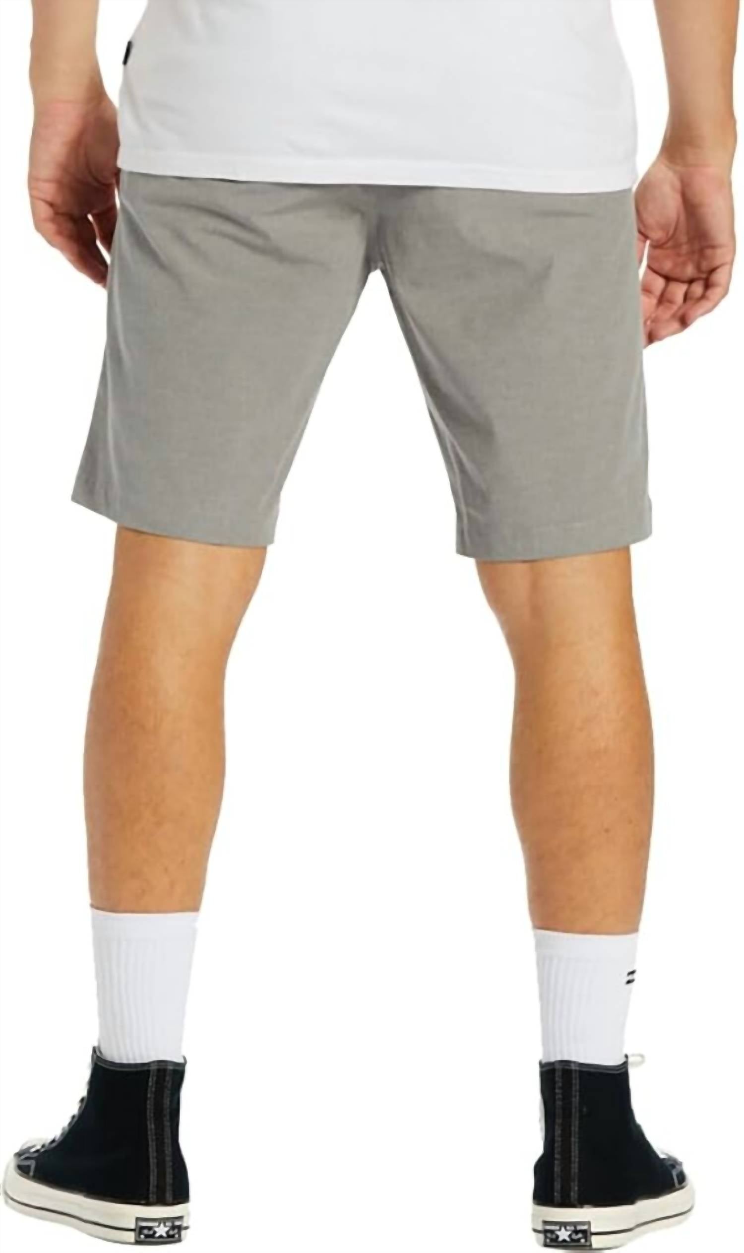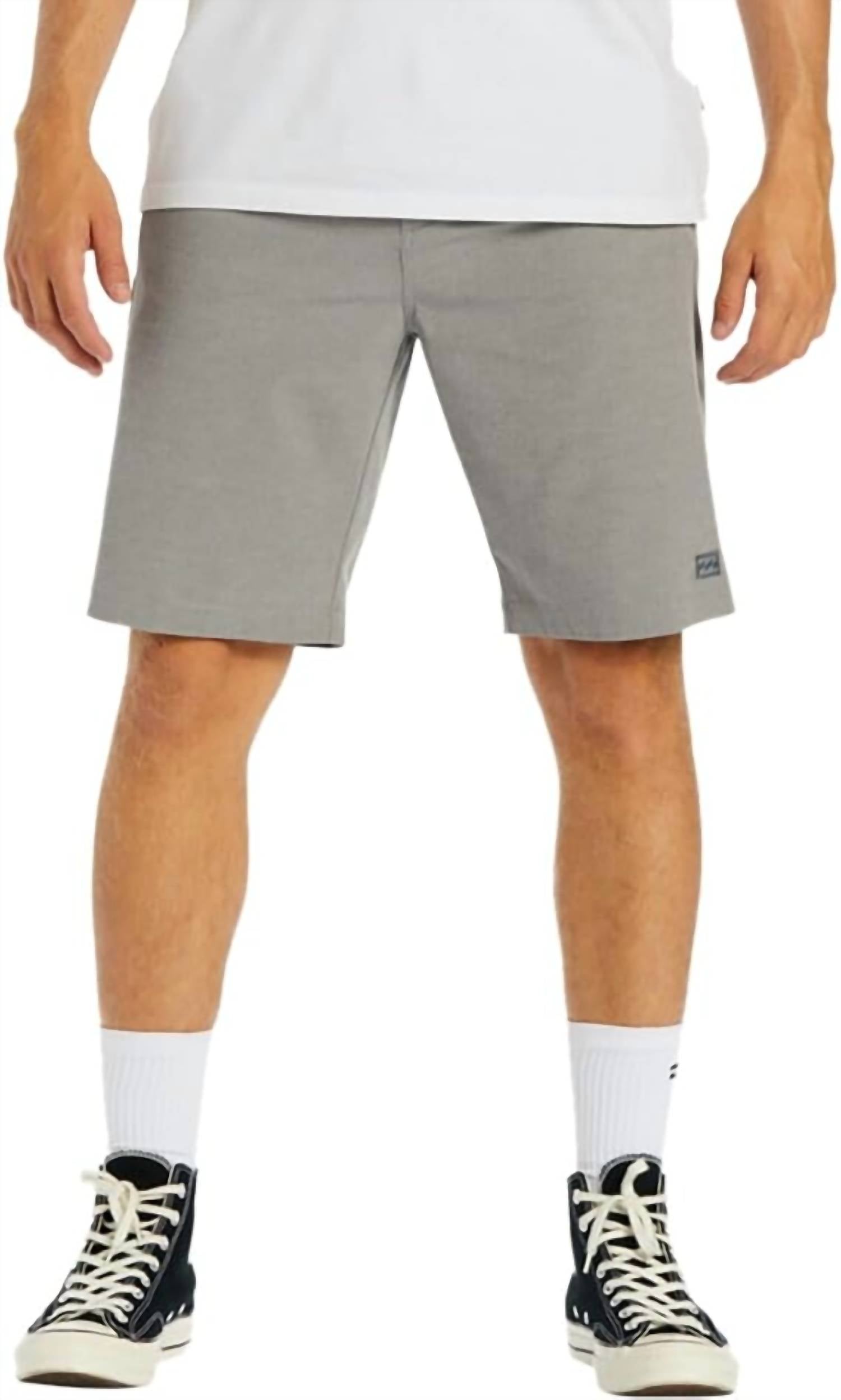 Elevate your style with the Crossfire Hybrid Short by Billabong, designed for both work and beach getaways. These men’s shorts, available in a solid gray, feature a core fit with a 21" long outseam and offer the traditional chino styling with a modern twist. Crafted from a blend of 64% Polyester, 22% Organic Cotton, 8% Elastane, and 6% Polyamide, they provide 4-way stretch and quick-drying capabilities thanks to a micro-repel coating. Closure is secured with a button, and they incorporate practical slant front pockets and a zipped back right pocket. Care: Machine wash.
