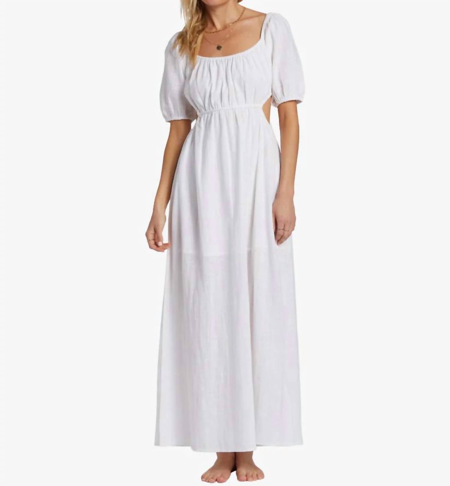 Style this maxi with your favorite statement necklace and sandals for the perfect look. Slip into the ethereal On The Coast Maxi Dress by Billabong, featured in the Return To Paradise collection. Designed with short puff sleeves and a scoop neckline, this salt crystal-hued piece is crafted from 100% cotton slub fabric, offering a breathable fit perfect for summer days. The fitted bodice and easy A-line skirt silhouette include a striking cut-out detail at the waistline, adding a touch of minimalist charm to your vacation wardrobe. Closure: Pull-on. Care: Machine wash.