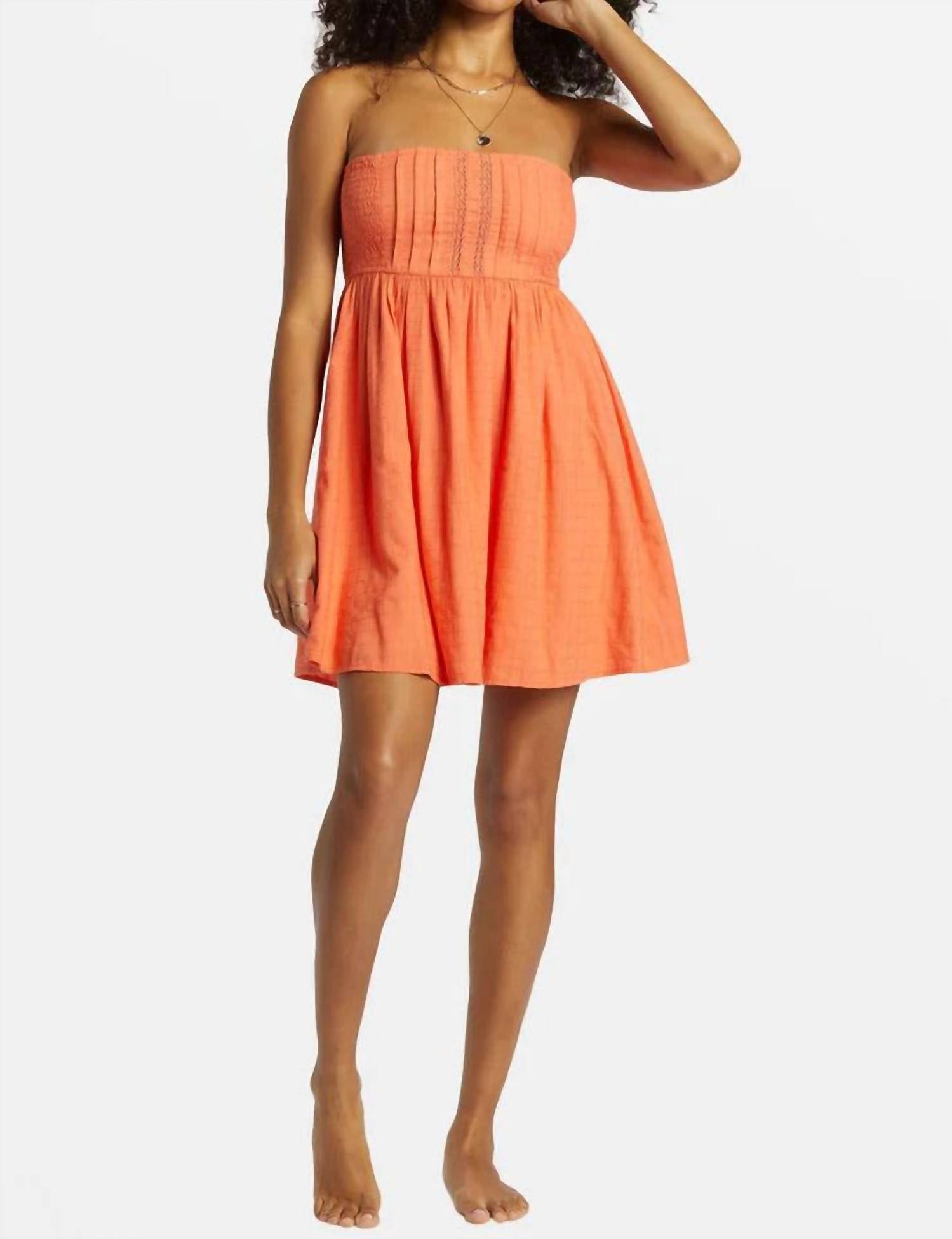 Pair with your favorite sandals for an effortlessly chic look. Step into summer with the vibrant Sweet Papaya Summers End Dress by Billabong, part of the Sunshine Diaries collection. This strapless A-line dress features a fitted bodice with smocking at the back and charming lace trims and pintucks on the front, ensuring both comfort and style. Made from 100% cotton, it boasts a textured cotton gauze fabric with a fixed pull-on closure for easy wear. Care: Machine wash.