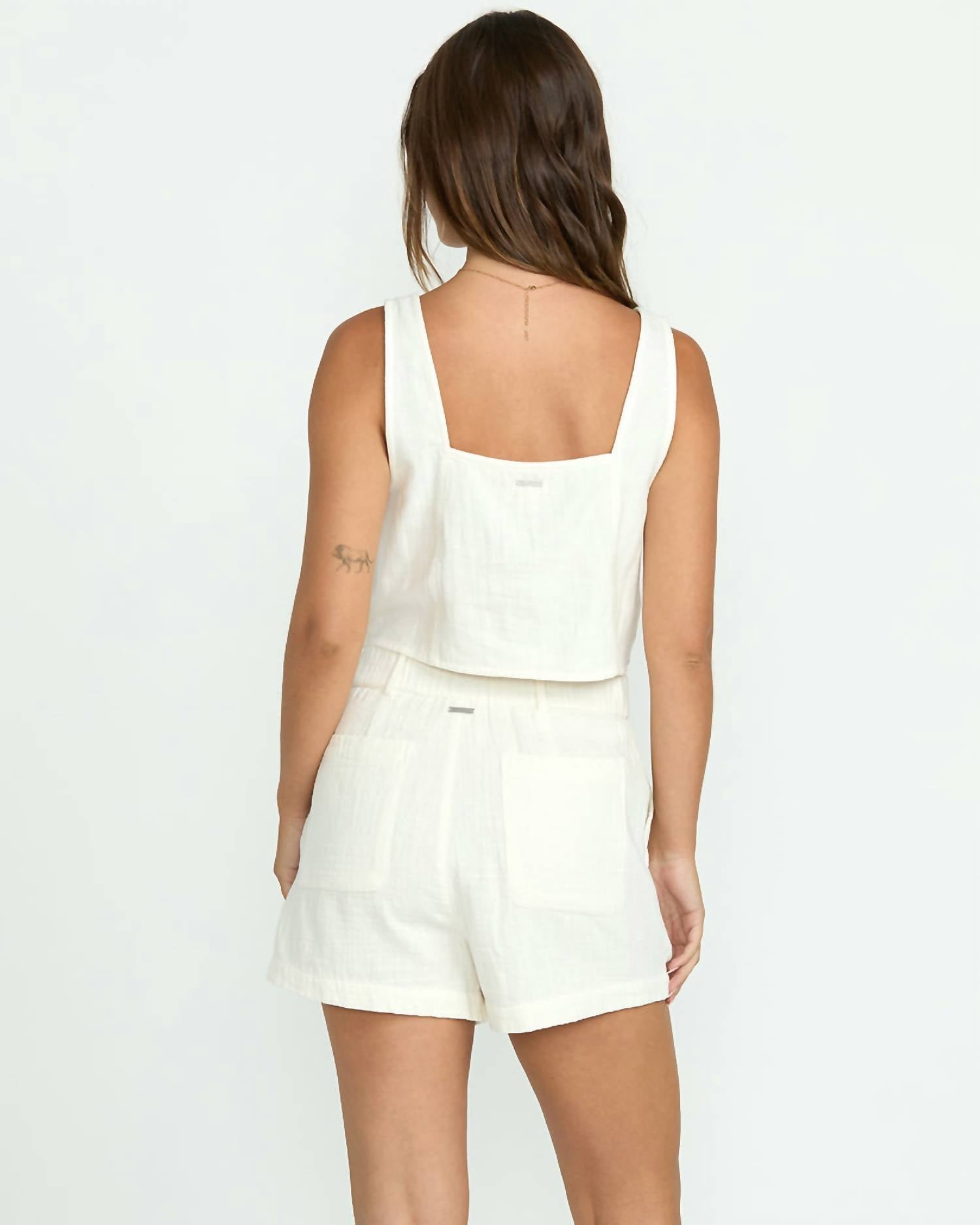 High-waist is here to stay and we especially love this style short. Discover the Tailor Made Short by Billabong, designed for a minimalist summer look in a clean Salt Crystal hue. These shorts offer the comfort of 100% cotton double slub gauze and a regular fit, ideal for vacation styling. With a thoughtful design, they feature an elastic back waist, a flat front waistband with button and fly closure, side seam pockets, and back patch pockets with a practical 2.5" inseam. This high-waist, solid-patterned piece is perfect for women embracing a vacation-ready wardrobe.
