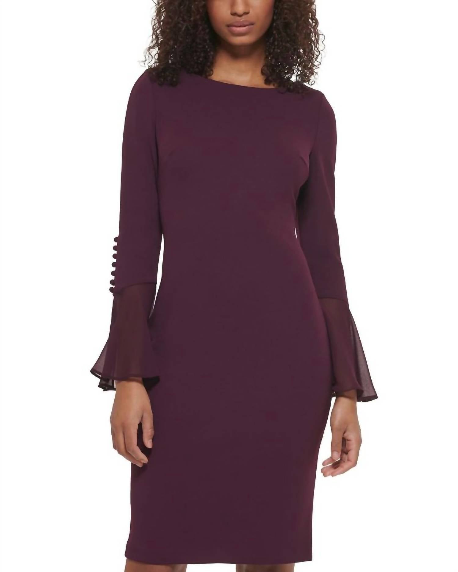 The perfect length dress does exist. Scuba crepe sheath dress with tulip sleeves, crew neckline, short sleeves, zippered back closure, and straight hemline. Dry clean onnly.