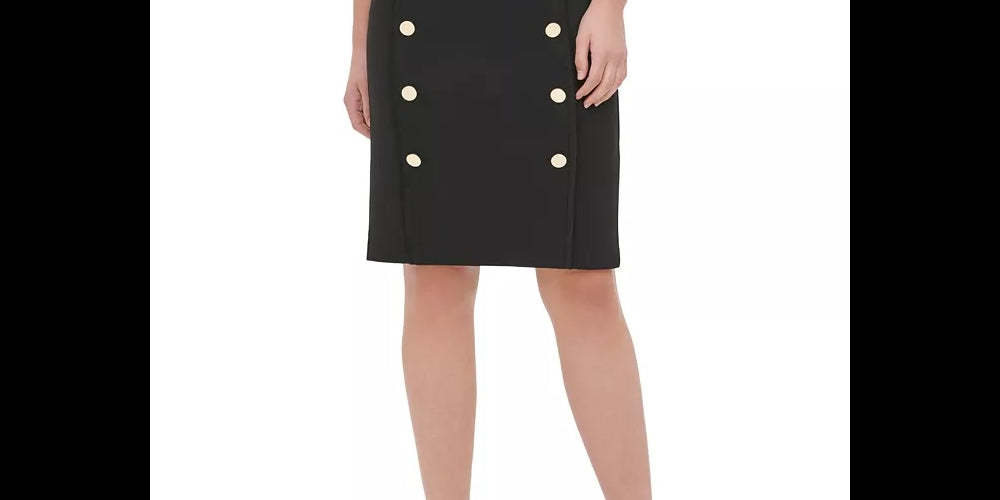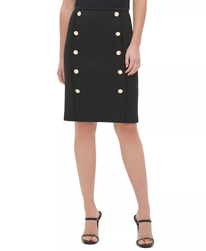 Approx. 24 long; pencil silhouette|Hidden zipper at back|Button trim at front; faux-suede trim at front|Lined|Polyester/spandex; lining and trim; polyester|Dry clean