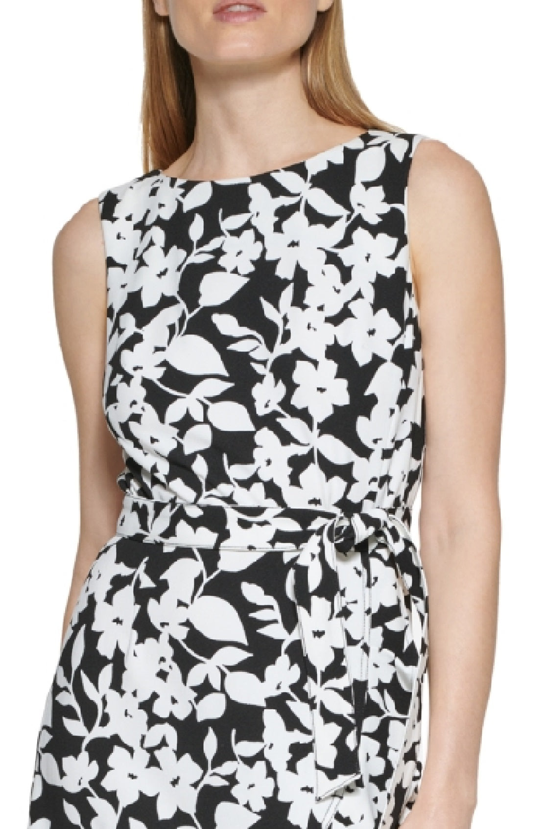 A ruffled hem lends a feminine flourish to Calvin Klein's floral-print sheath dress.| Approx. 39-1/4 long from center back neck to hem. Length is based on size 6 and varies 1/4 between sizes| Tailored fit through the chest| waist| and hips; sits close to the body| Scuba crepe; Stretchy and supportive| Boat neckline; Sheath silhouette