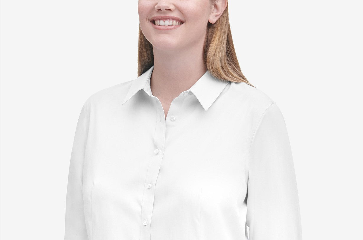 Hits at hip|Point collar; front button closures|Buttoned cuffs|Point collar; front button closures