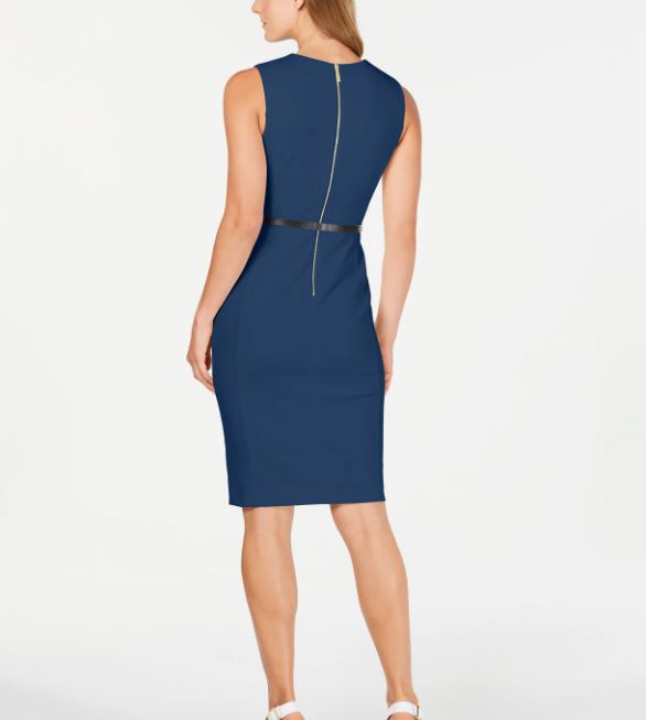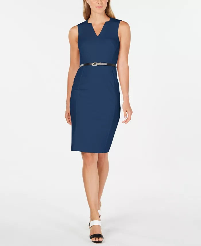 Approx. 37-3/4" long from center back neck to hem. Length is based on size 4P and varies 1/4" between sizes|Designed to fit and flatter 5'4" and under frame|V-neck; Sheath silhouette|Gold-tone back zipper closure|Polyester/spandex; partially lined skirt: polyester; faux-leather belt: polyurethane|Dry clean|Imported