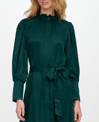 Calvin Klein Women's Belted Textured Button Cuff Houndstooth Balloon Sleeve Mock Neck Midi Cocktail Shirt Dress Green Size 2