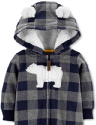 Carter's Boy's Plaid Buffalo Check Polar Bear Ears Hooded Fleece Playsuit Gray Size 3MOS