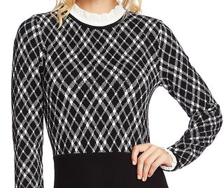 Cece Women’s Ruffled Collar Jacquard Fit & Flare Sweater Dress Black Size Large