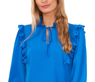 CeCe Women's Ruffle Neck Long Sleeve Blouse Blue Size Small