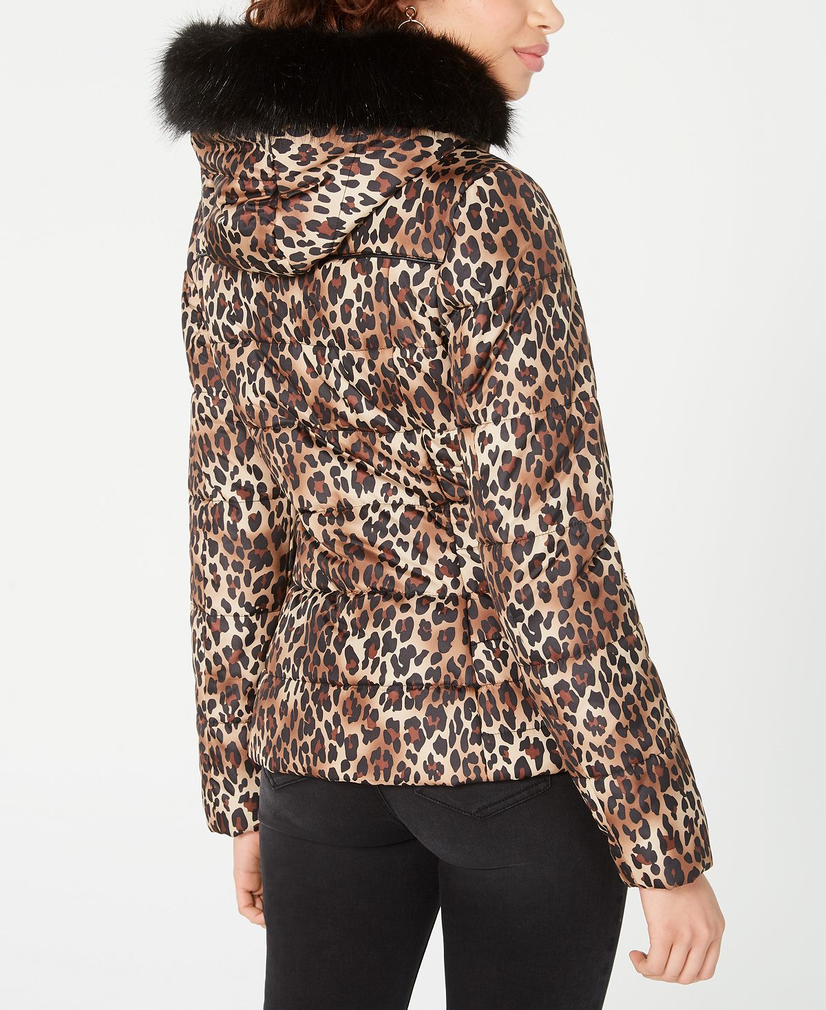 Fierce and fashion-forward| this puffer coat from Celebrity Pink comes alive with gorgeous faux-fur trim| sleek faux-leather trim and a wildly fun leopard print