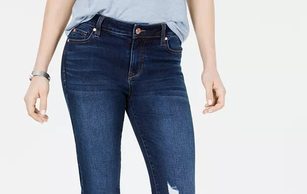 Approx. inseam: 25"|High rise: approx. 10"; leg opening: approx. 10"|Zipper and button closure; belt loops|Whiskered at upper thigh; rips at knee|Cotton/modal/polyester/rayon/spandex|Machine washable