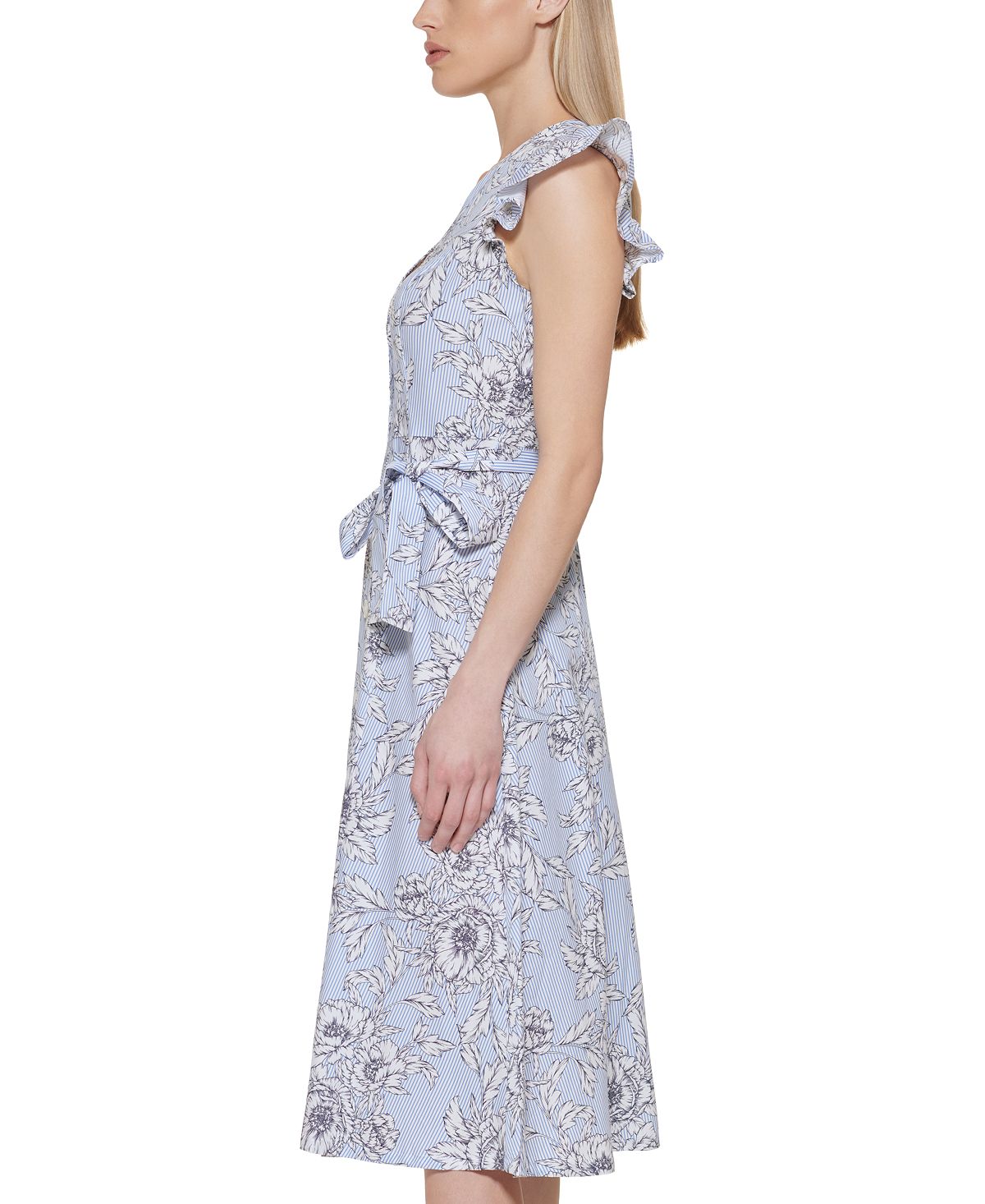 Pull off floral-inspired style like a pro in this beautiful shirt-style dress from Tommy Hilfiger designed with fluttery sleeves.| Approx. 45-1/2 long from center back neck to hem. Length is based on size 4 and varies 1/4 between sizes| Falls below the knee to lower calf| V-neck; Midi silhouette| Front button placket| Flutter sleeves