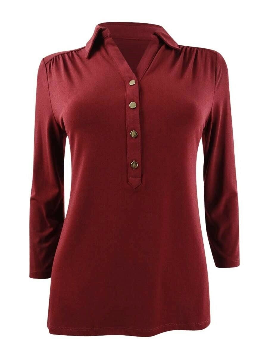 3/4-sleeves|Collar; partial button-front closures|Due to generous sizing, we suggest sizing down for the perfect fit